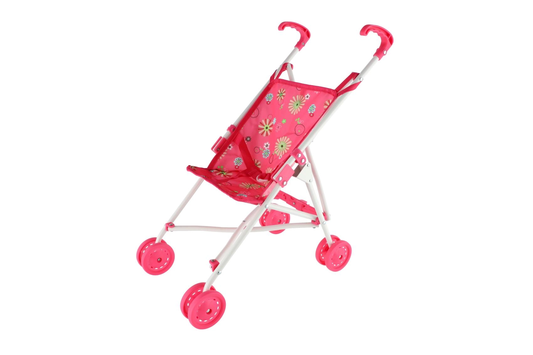 Este cochecito rosa para muñecas con funda de flores es práctico, ligero y diseñado para el juego diario. Los niños apreciarán las empuñaduras cómodas, el movimiento suave de las cuatro ruedas dobles y el cinturón de seguridad que mantiene a la muñeca en su lugar. La estructura es de metal y la funda de tejido resistente: fácil de mantener y duradera.