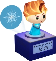 Despertador de mesa luminoso con la figura de la princesa Elsa de la película Frozen. Incluye cable USB para alimentación y proyección en la pared para conciliar el sueño más fácilmente.