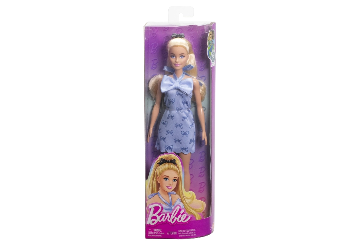 Esta moderna Barbie Modelo destaca con un vestido azul claro decorado con estampado de lazos y un lazo llamativo en el escote. El cabello rubio largo con un elegante lazo negro y los zapatos a juego le dan a la muñeca un aspecto icónico que te encantará al instante. Gracias a sus articulaciones móviles, adopta poses naturales con facilidad, lo que fomenta la imaginación y el desarrollo de la motricidad fina.