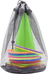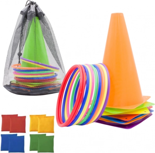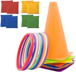 El contenido del juego incluye 11 aros de colores, excelentes para juegos de lanzamiento y actividades de destreza, 6 conos de entrenamiento para circuitos de obstáculos y 10 saquitos de gimnasia que pueden usarse para juegos sensoriales, lanzamiento o como lastre. Todos los componentes están fabricados con materiales duraderos y seguros, adecuados para niños y adultos.