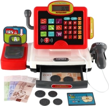 El set incluye todo lo que un pequeño vendedor necesita: lector con luz LED y sonido para escanear productos, billetes y monedas de juguete para pagar, ranura para tarjeta de crédito para transacciones sin efectivo, calculadora funcional para sumar y una balanza para frutas y verduras. El embalaje práctico facilita el almacenamiento y el transporte.