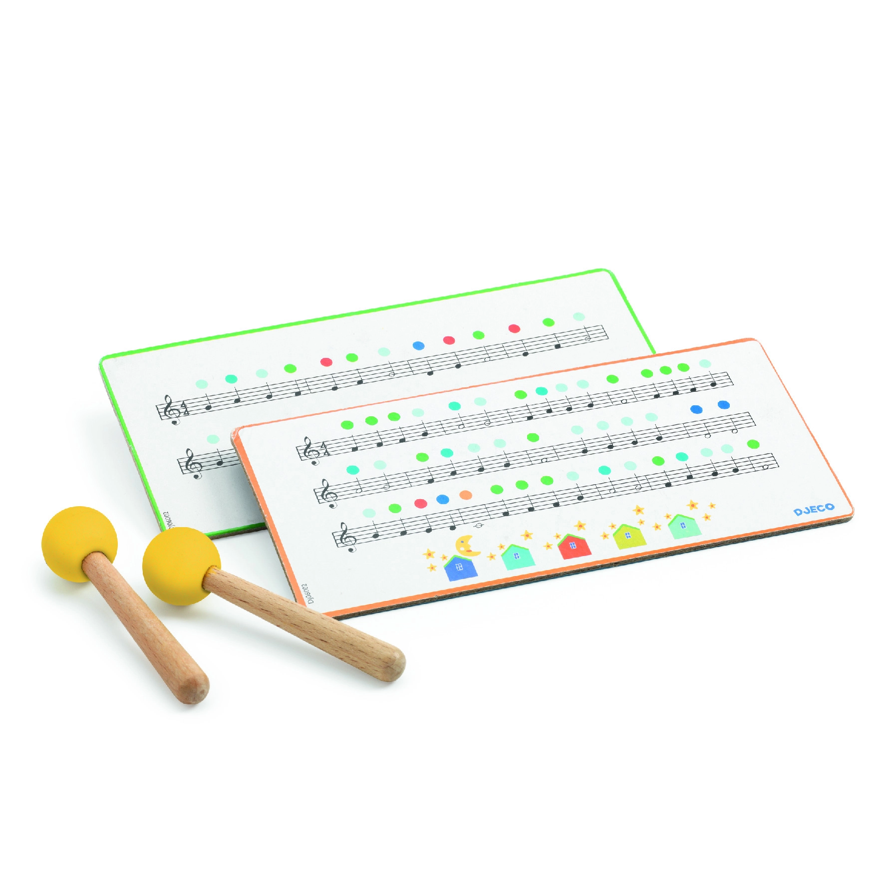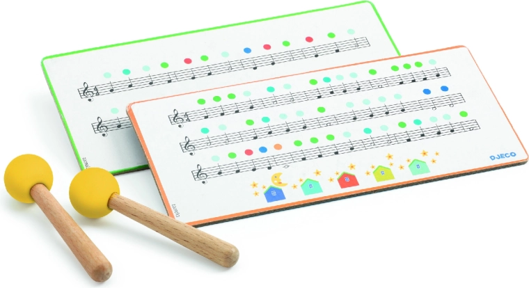 Las lengüetas numeradas y las baquetas incluidas permiten a los niños tocar de inmediato melodías agradables sin experiencia previa.