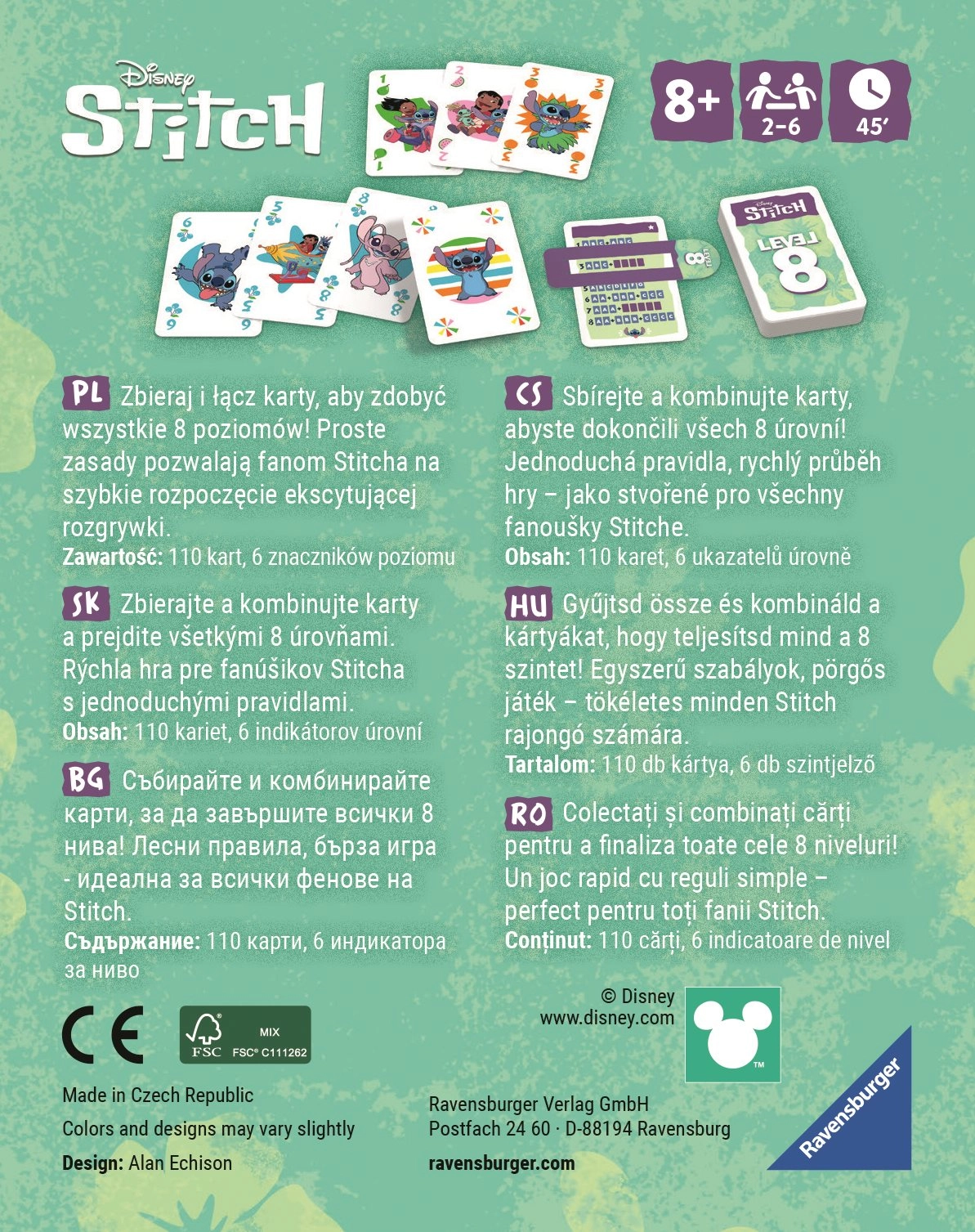 Entra en el mundo DISNEY con el dinámico reto de cartas RAVENSBURGER LEVEL 8 DISNEY: STITCH. El objetivo es ir superando niveles mediante combinaciones inteligentes: escaleras, tríos y otros conjuntos. Gracias a sus reglas claras, el juego se explica rápido y fluye de maravilla.