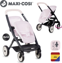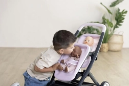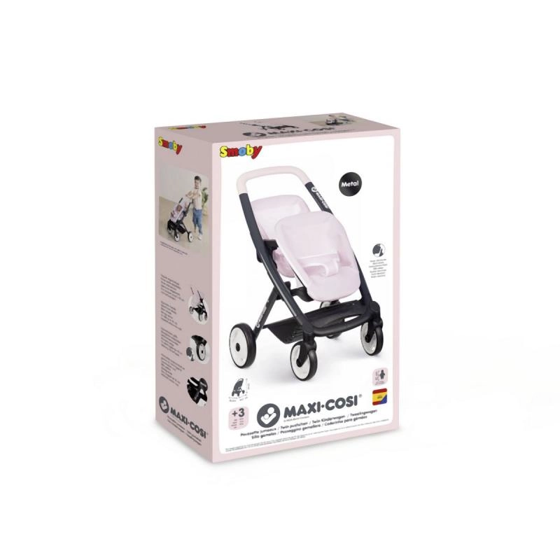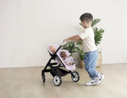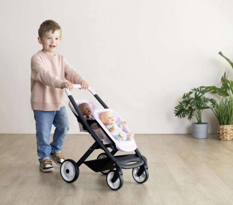 Cochecito deportivo para muñecas gemelas de la marca Smoby con un precioso diseño Quinny. Este cochecito moderno cuenta con asientos desmontables y ruedas silenciosas, lo que garantiza un uso cómodo.