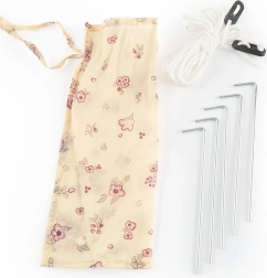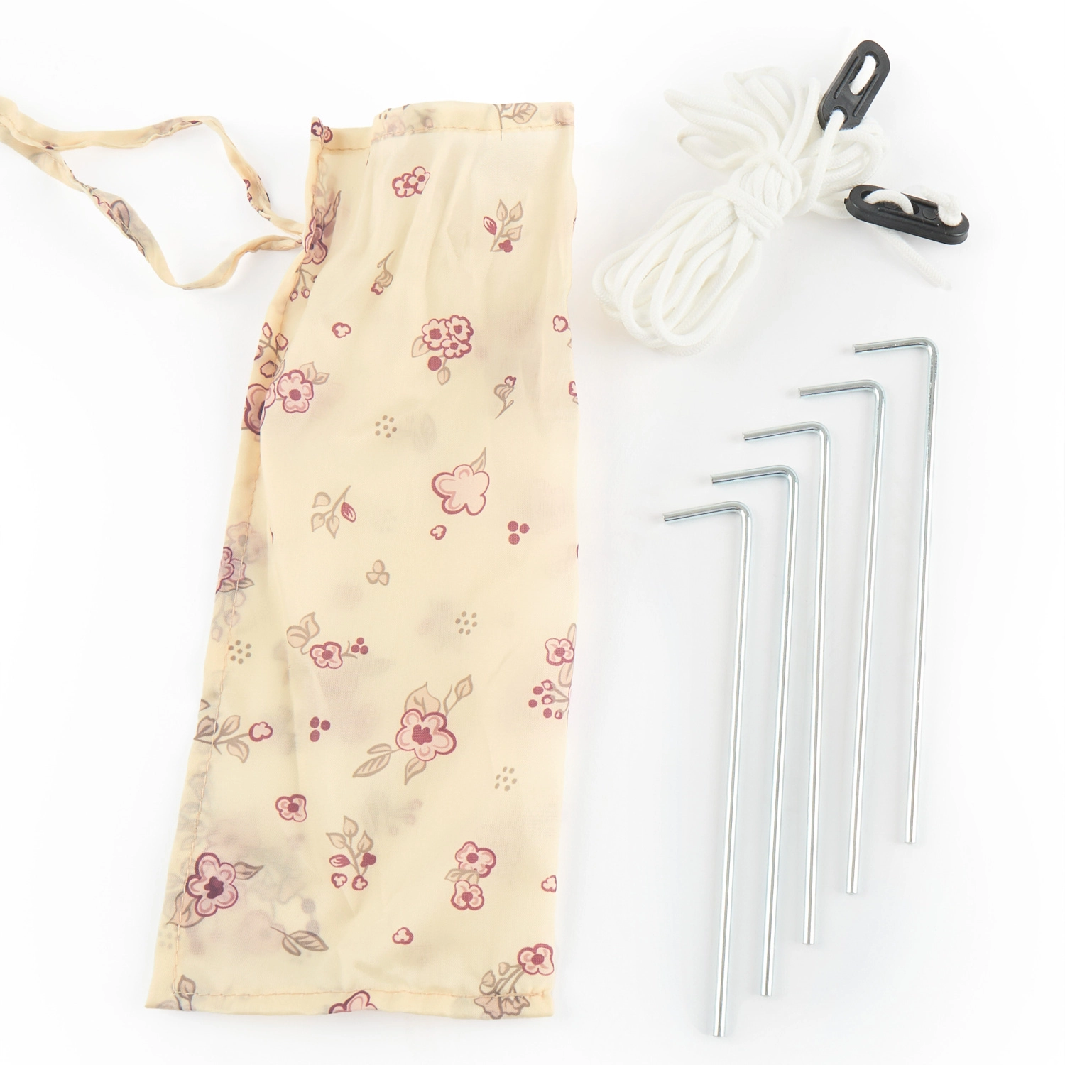 El contenido del paquete incluye la tienda de playa, dos bolsas de almacenamiento, cuatro piquetas y cuerdas de anclaje. Las dimensiones de la tienda son 130 x 115 x 130 cm y está fabricada en 100% poliéster.