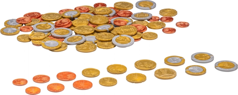Las monedas están hechas de plástico 100% reciclable, lo que protege el medio ambiente. Cada paquete contiene 80 monedas de diferentes denominaciones (de 1 céntimo a 2 euros), para que los niños disfruten de un juego con dinero realista.