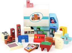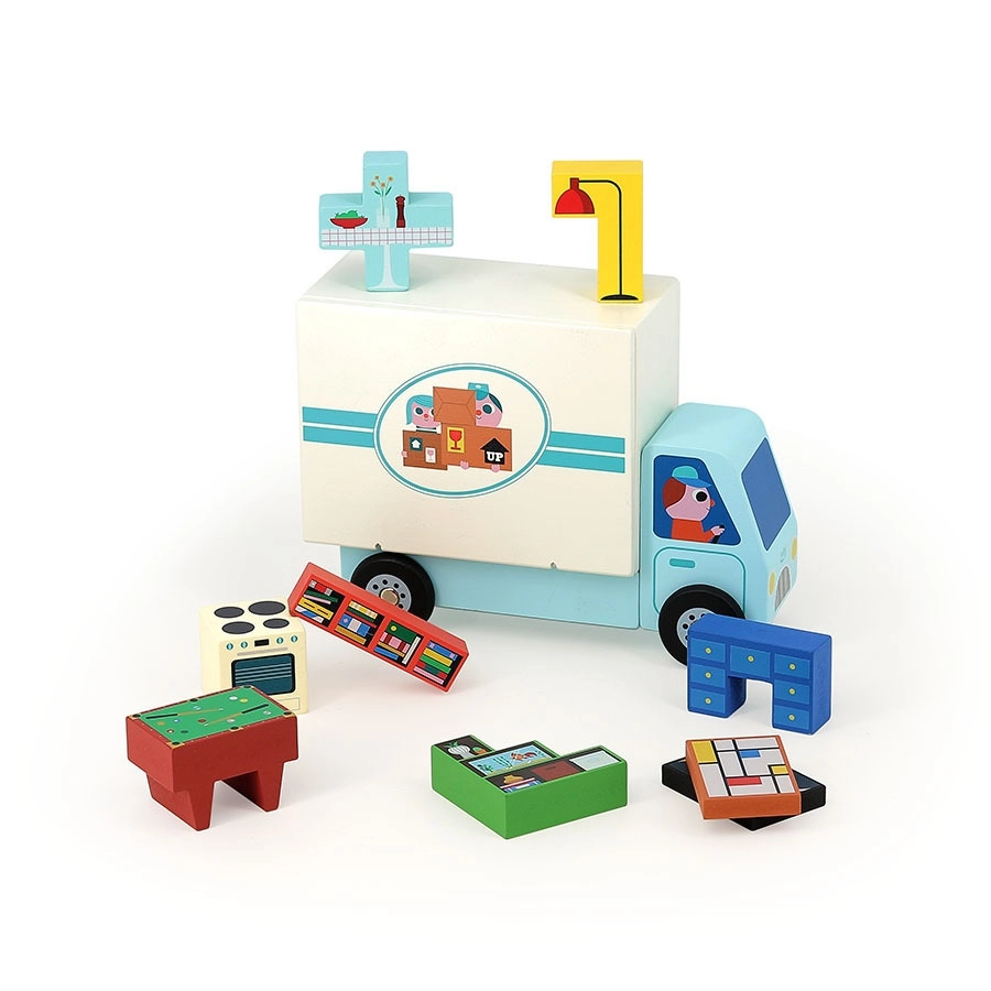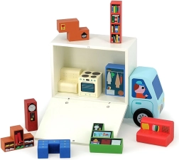 El set incluye un camión de mudanzas de madera y 19 piezas con forma de muebles, ideal para jugar tanto en solitario como en familia.