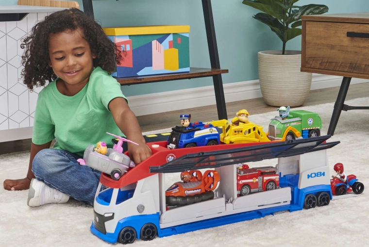 El enorme transportador inspirado en la popular serie PAW PATROL encantará a todos los pequeños rescatistas. Gracias a los paneles laterales abatibles y a las rampas, el camión se convierte en un taller móvil y centro de mando. Al pulsar el botón con la huella se activan sonidos realistas de motor, bocina y marcha atrás, que intensifican aún más la experiencia de juego.
