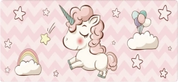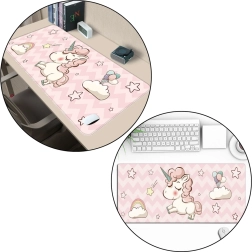 La alfombrilla está hecha de goma suave pero resistente, que asegura una sujeción estable a la superficie de la mesa y evita el deslizamiento. La capa superior del material es agradable al tacto y resistente a la abrasión. El diseño rosa con motivos de unicornio, nubes y estrellitas aporta un ambiente de cuento y da vida al espacio.