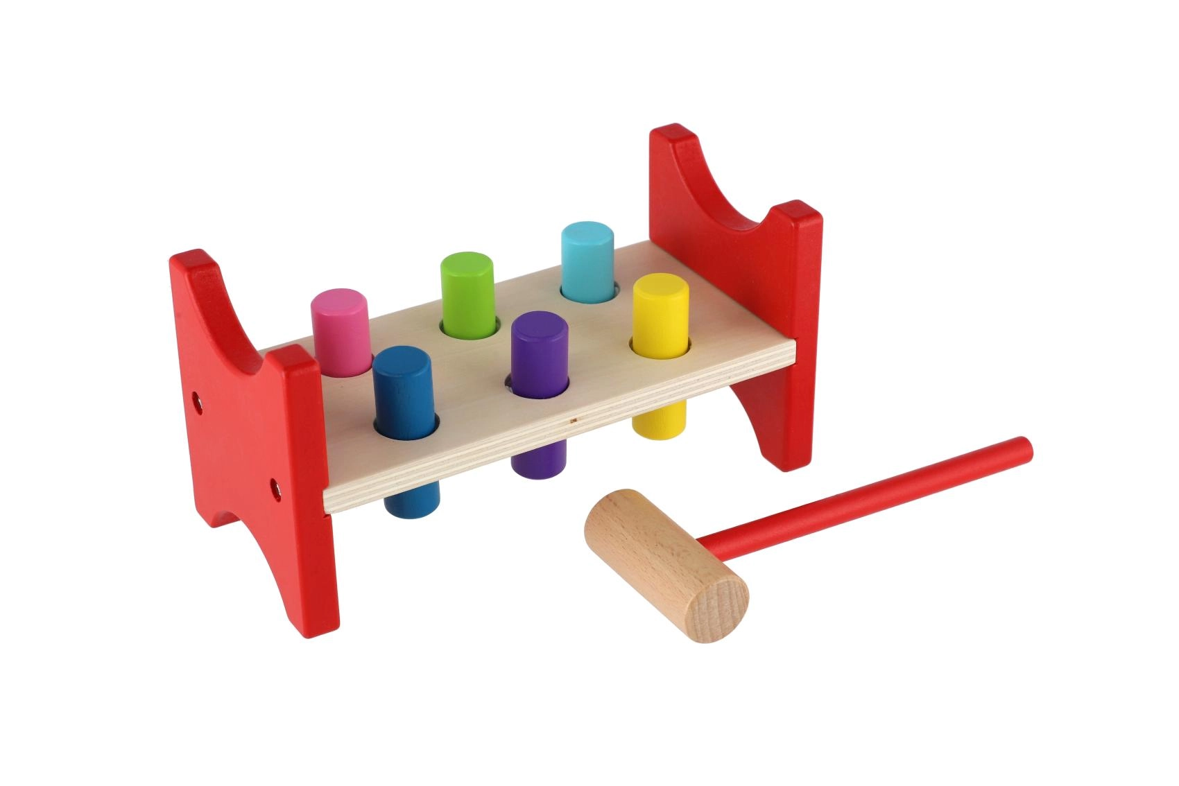 El martillo de madera ligero se adapta a las manos infantiles y ayuda a desarrollar de forma segura la coordinación mano–ojo y la fuerza de agarre.