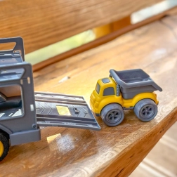El gran portador con rampas permite cargar y transportar fácilmente los tres vehículos. La estructura estable soporta incluso un juego infantil intenso.