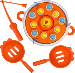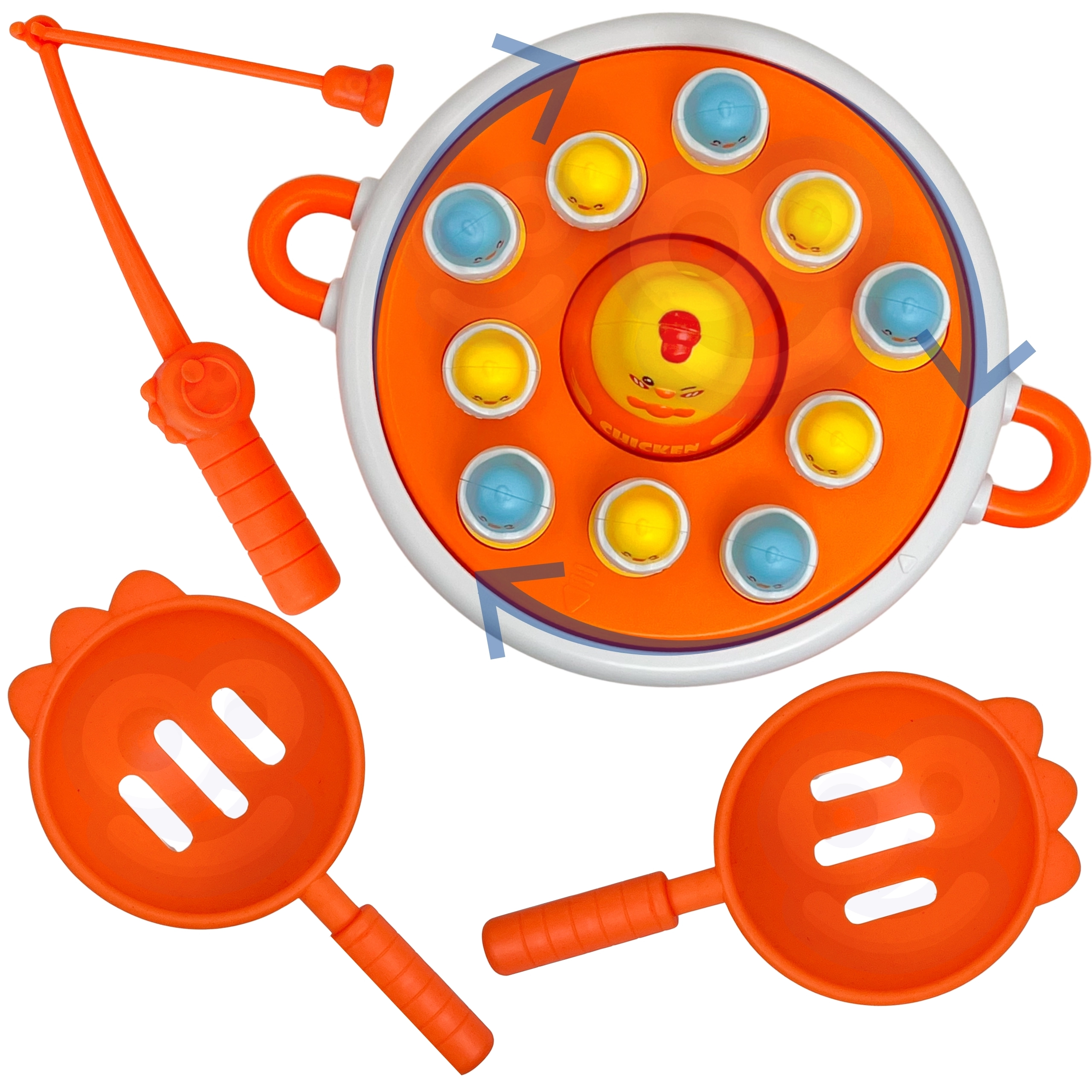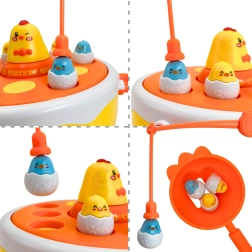 - Contenido del paquete: base con música y rotación, 10 pollitos magnéticos, 2 palas, 1 caña, 1 pollito grande desmontable, caja