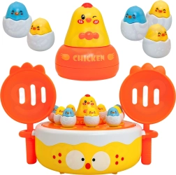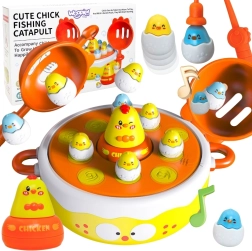 Este juguete versátil combina hasta cuatro juegos en un solo set, por lo que la diversión no se agota fácilmente. La base giratoria con música hace que los pollitos se eleven al azar; se pueden pescar con la caña magnética o atrapar con las palas tras su lanzamiento desde la catapulta. El pollito grande desmontable funciona como un juguetón cochecito.