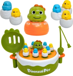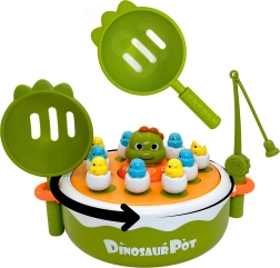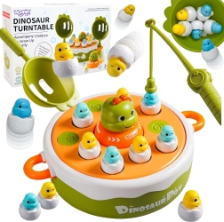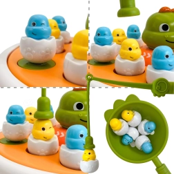 Viaja con los niños a la prehistoria con el juego interactivo de la marca WOOPIE. Este versátil set 4en1 combina pesca magnética, un divertido juego de catapulta, un mini coche–dino y en el reverso de la base también tres en raya. Las coloridas figuritas de dino–pollitos en “cáscaras” y la destreza al manejar cañas y palas desarrollan la motricidad fina, las habilidades de coordinación y la juego compartido en pareja.