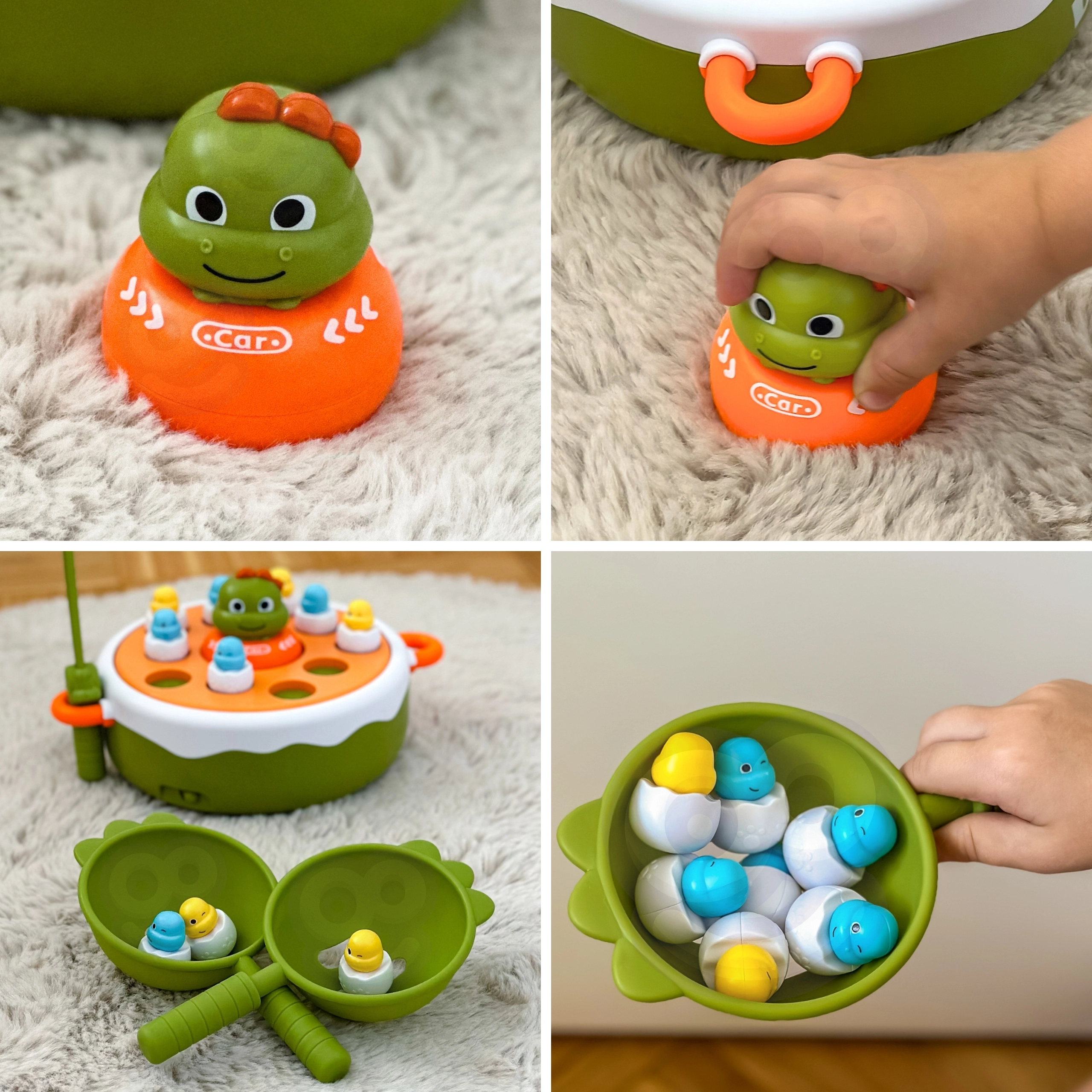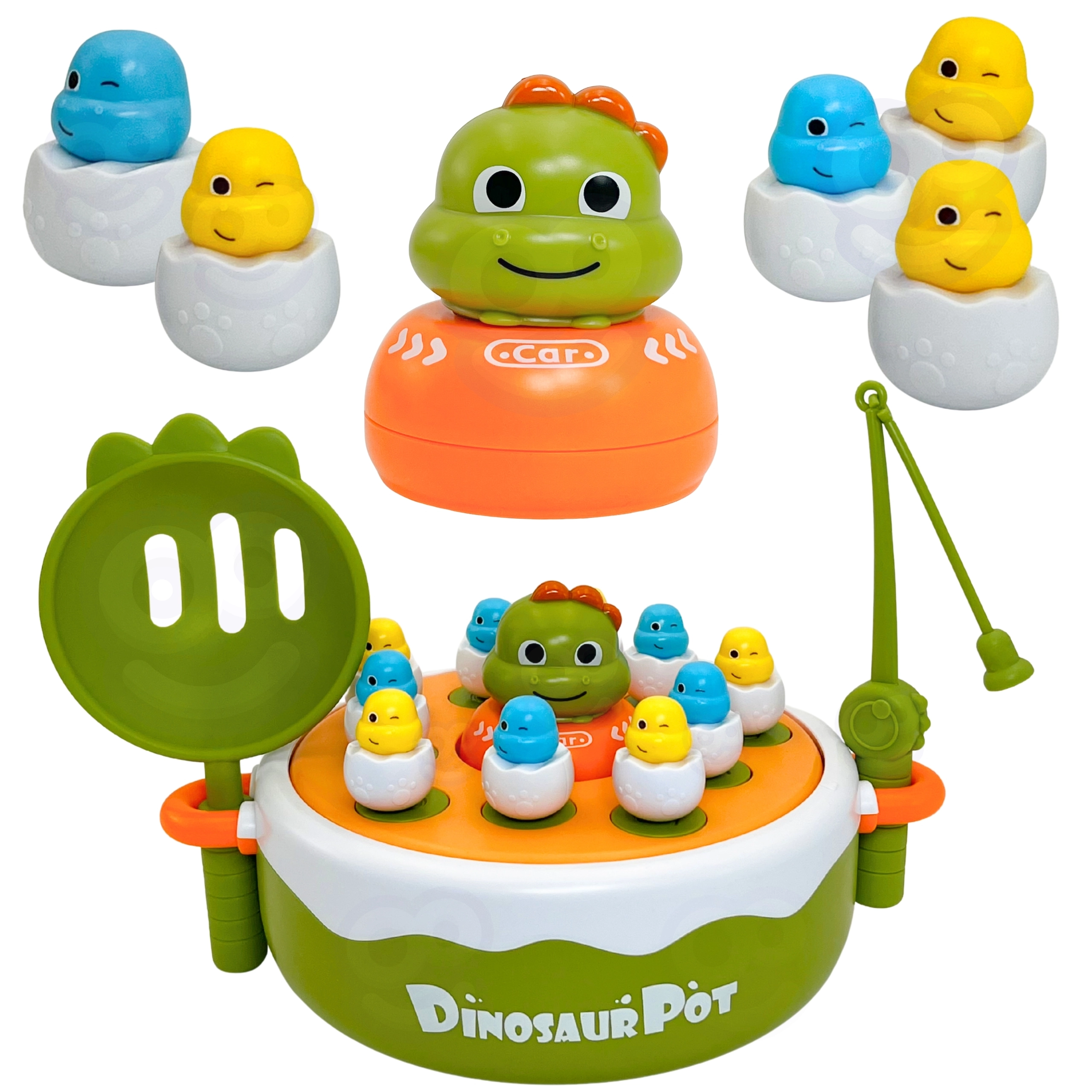 - Plataforma giratoria de doble cara con asas, figuritas de dinos en “huevitos”, 1× caña magnética, 2× palas, dino–coche, embalaje para regalo