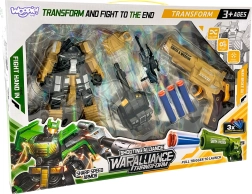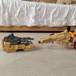 Contenido del paquete: 1× robot/tanque transformable, 1× pistola (revólver), 3× dardos de espuma, accesorios de combate adicionales.