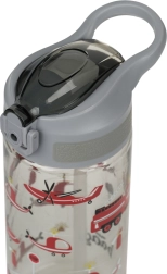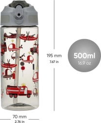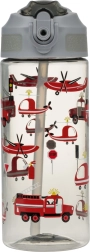Botella de plástico transparente con ilustraciones de camiones de bomberos y helicópteros rojos, ideal para divertirse con cada sorbo.
