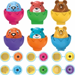 Este set incluye seis huevos de colores, dentro de los cuales encontrarás divertidos animalitos. La tarea del niño no es solo abrir el huevo, sino sobre todo colocarlo en el lugar correcto dentro de la bandeja especial. Cada huevo tiene en la parte inferior una forma geométrica única que corresponde a una abertura de la caja. Al presionar la figurita del animal se activa un efecto de sonido. Las caritas sonrientes colocadas en las cáscaras son una excelente manera de enseñar a los niños a reconocer y nombrar las emociones.