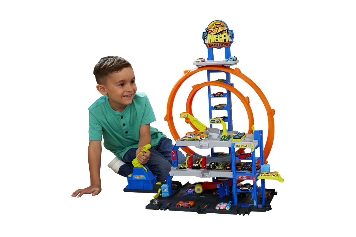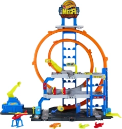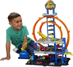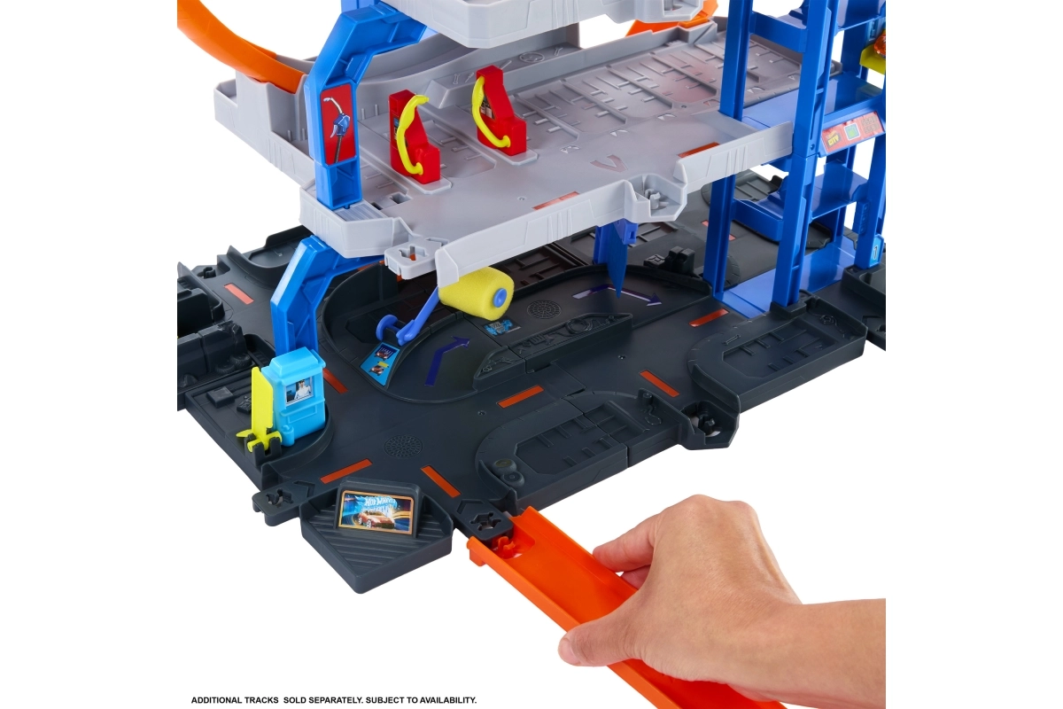 El maxi garaje Hot Wheels City ofrece un juego dinámico en tres niveles: desde el lavado en la planta baja, pasando por el ascensor manual, hasta el lanzamiento desde el nivel superior. El lanzador envía los coches al doble rizo, y los selectores determinan a qué piso llega el vehículo. Genial para juego individual o en grupo.