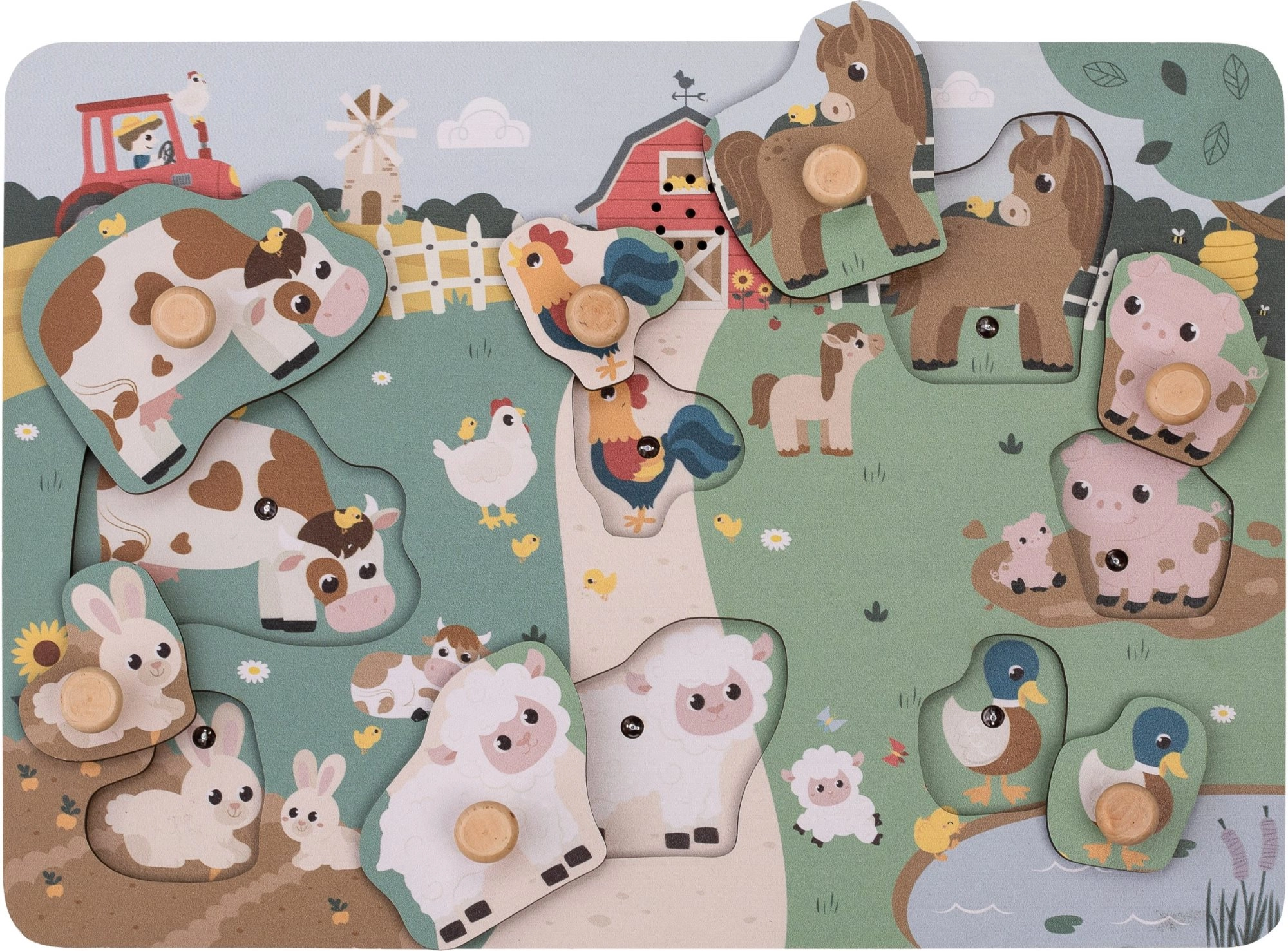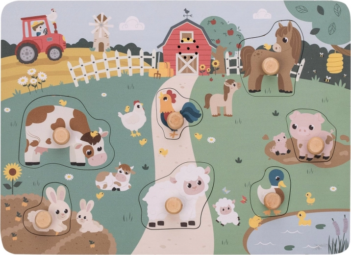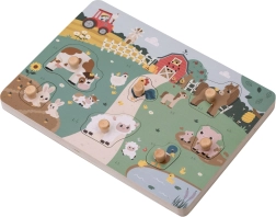 Puzzle de sonido de madera con motivo de animales de la granja que, al colocarlos, emiten sus sonidos característicos. Diversión perfecta para niños que desarrolla su imaginación y habilidades motoras.