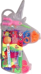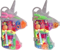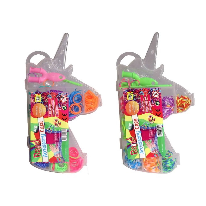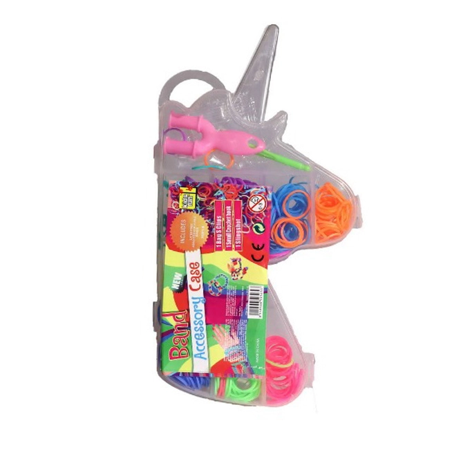 Todo está ordenadamente guardado en una práctica caja de plástico con forma de unicornio, que contiene pequeños compartimentos separados para organizar las gomas por colores. Este set no solo es divertido, sino que también desarrolla la creatividad infantil y la motricidad fina.