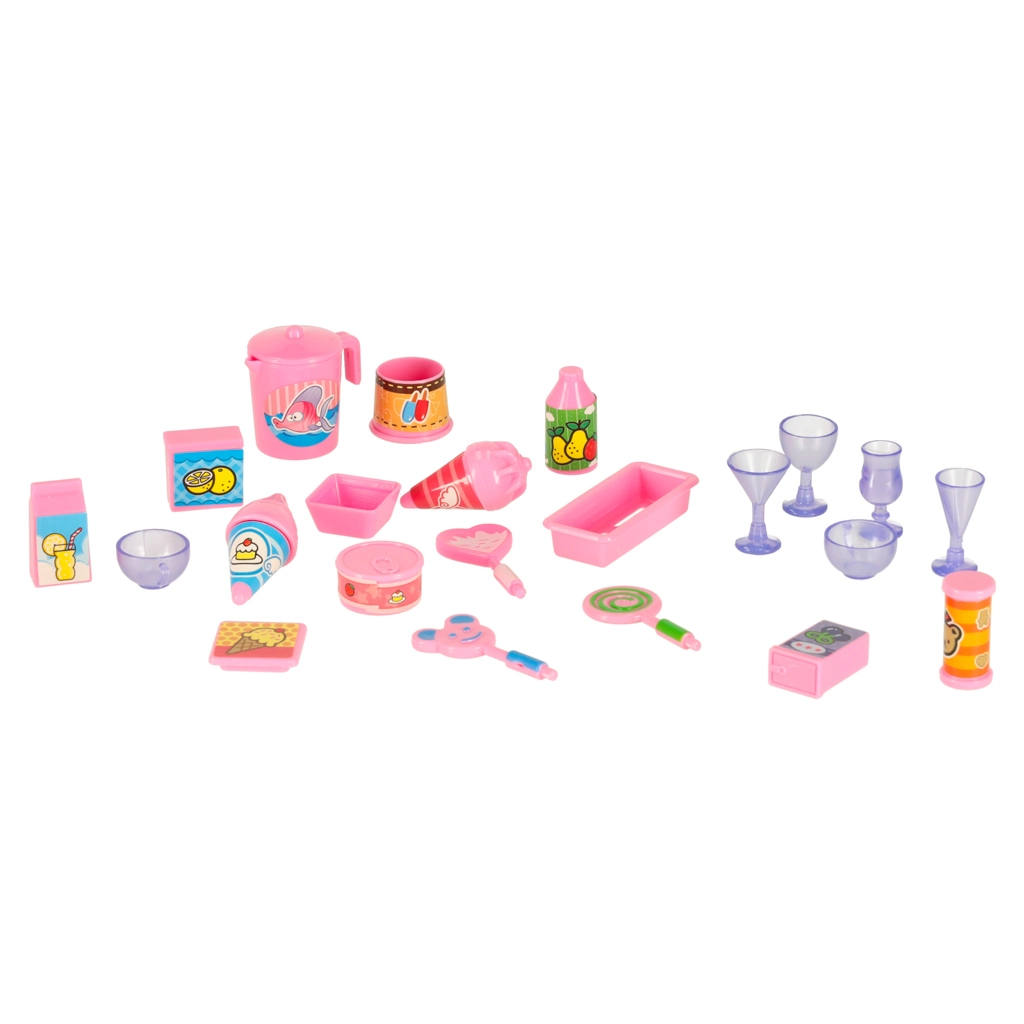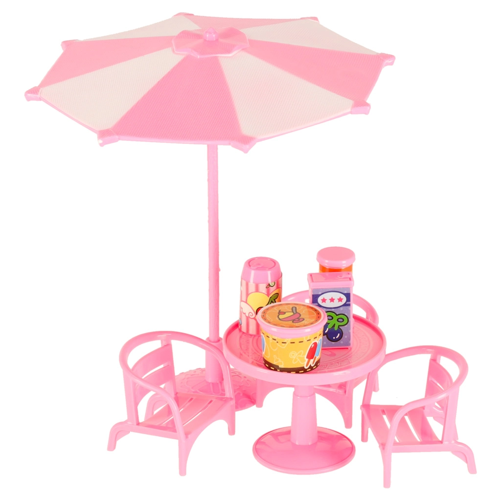Incluye un amplio set de accesorios: mesas, sillas, sombrilla, cartel publicitario y numerosos complementos pequeños como vasitos, copas, helados, jarrita y bandeja. La construcción de plástico ligera y resistente es perfecta para el juego diario en casa y de viaje.