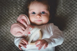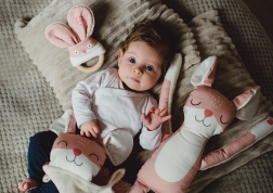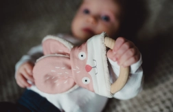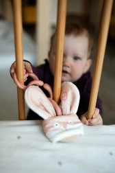 El mordedor ratoncito está hecho con tela de estampado de autor de Jitka de Ababu. Está certificado para bebés y cumple todas las normas de la UE para niños desde 0 años. Este juguete combina una carita textil suave de 100% algodón con un aro de haya hecho a mano. La toalla de bambú de la parte trasera proviene de materiales de la más alta calidad de Francia.