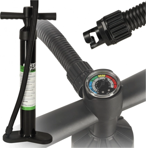 La bomba manual de alta presión para SUP es una herramienta indispensable para inflar de forma rápida y eficiente no solo tablas SUP, sino también otros productos inflables. Gracias al manómetro integrado puede controlar con precisión la presión para un inflado óptimo del equipo. La bomba cuenta con pies estables que garantizan estabilidad durante el inflado y un mango en “T” que ofrece un agarre cómodo y seguro, clave para un uso confortable. Con esta bomba, preparará la tabla rápidamente para el agua y disfrutará de cada aventura.