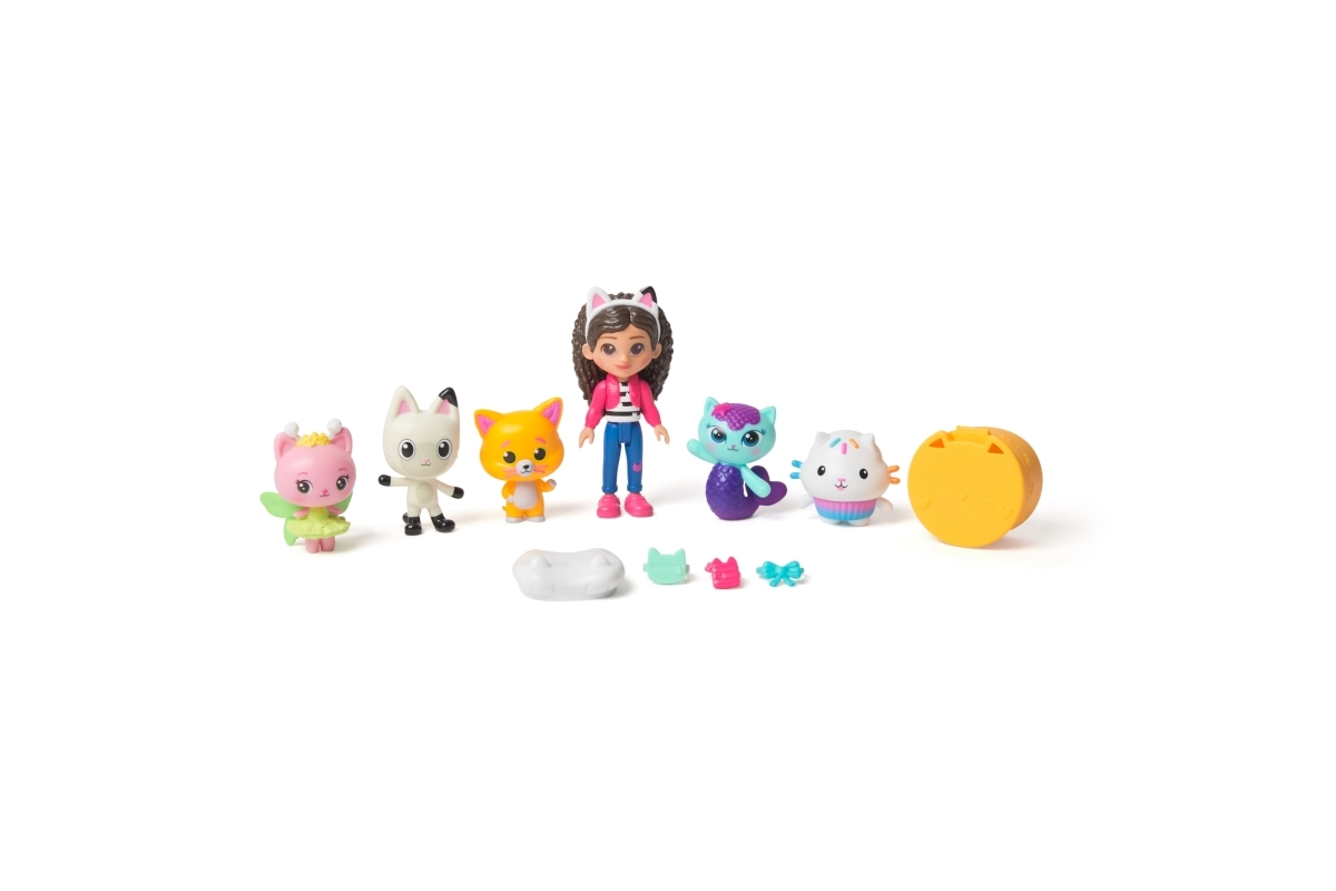 El equipo al completo en un solo set: Gabby, Panda Patitas, Hada Gatita, Pezgatita, Pastelín, Chumsley y más. Colores y detalles como en la película.