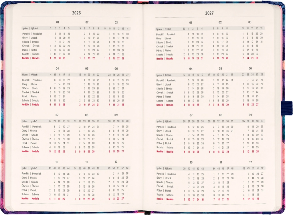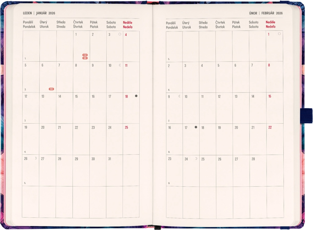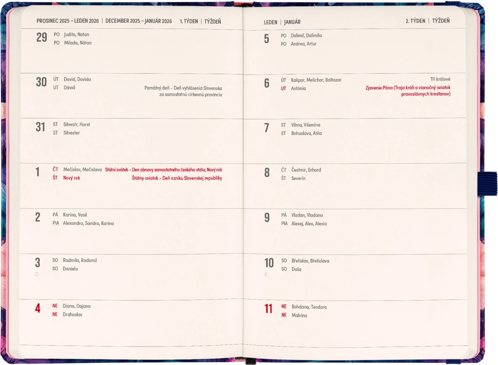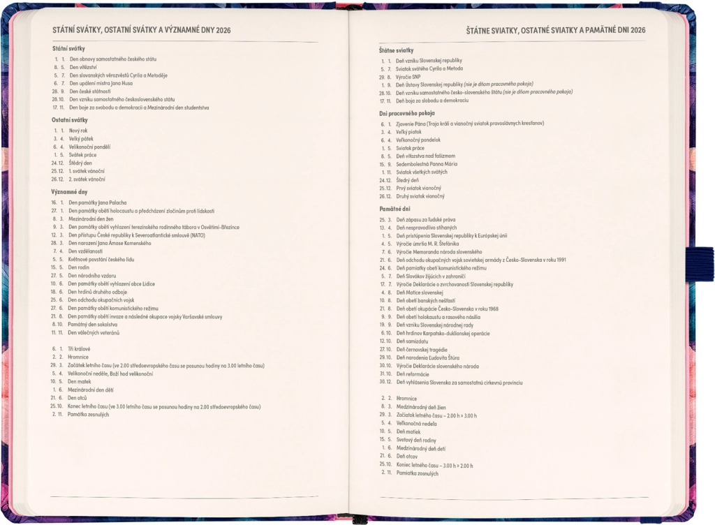 - Calendario quincenal horizontal con festivos checos y eslovacos para una planificación clara.