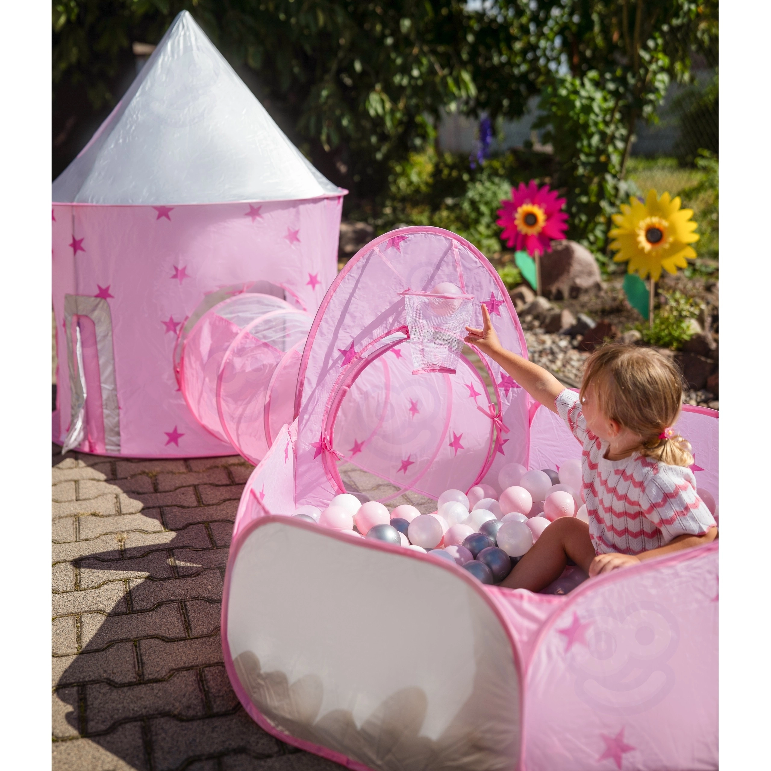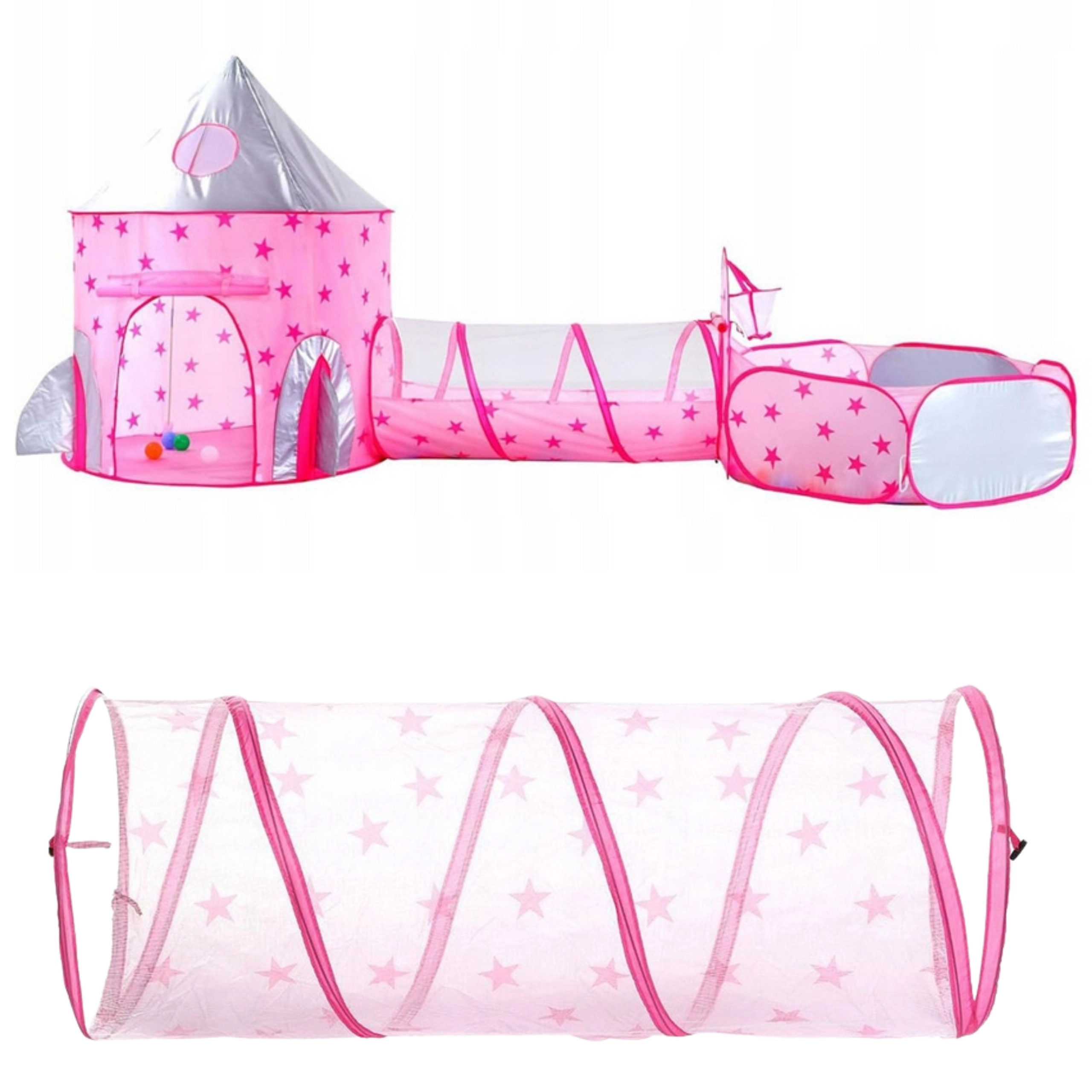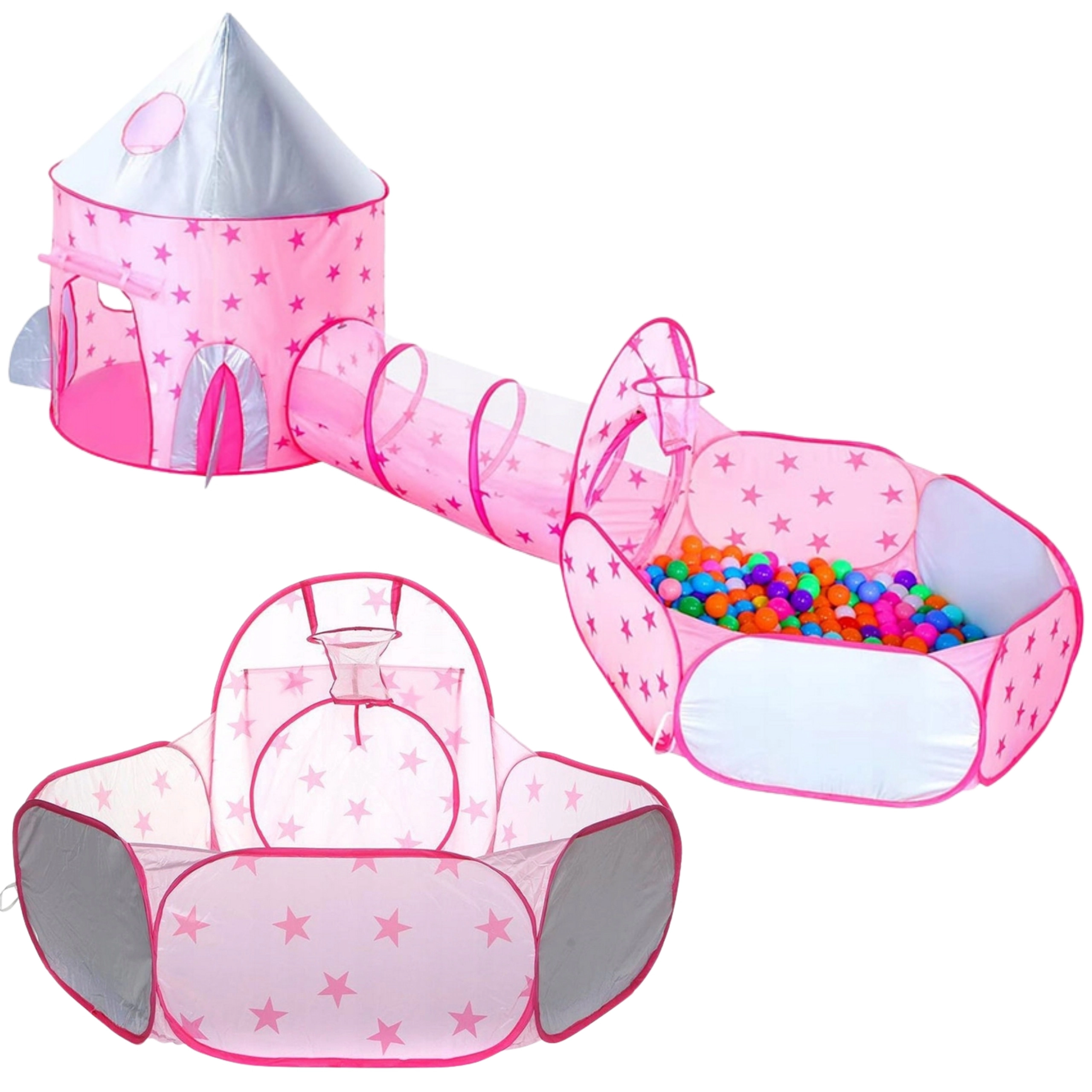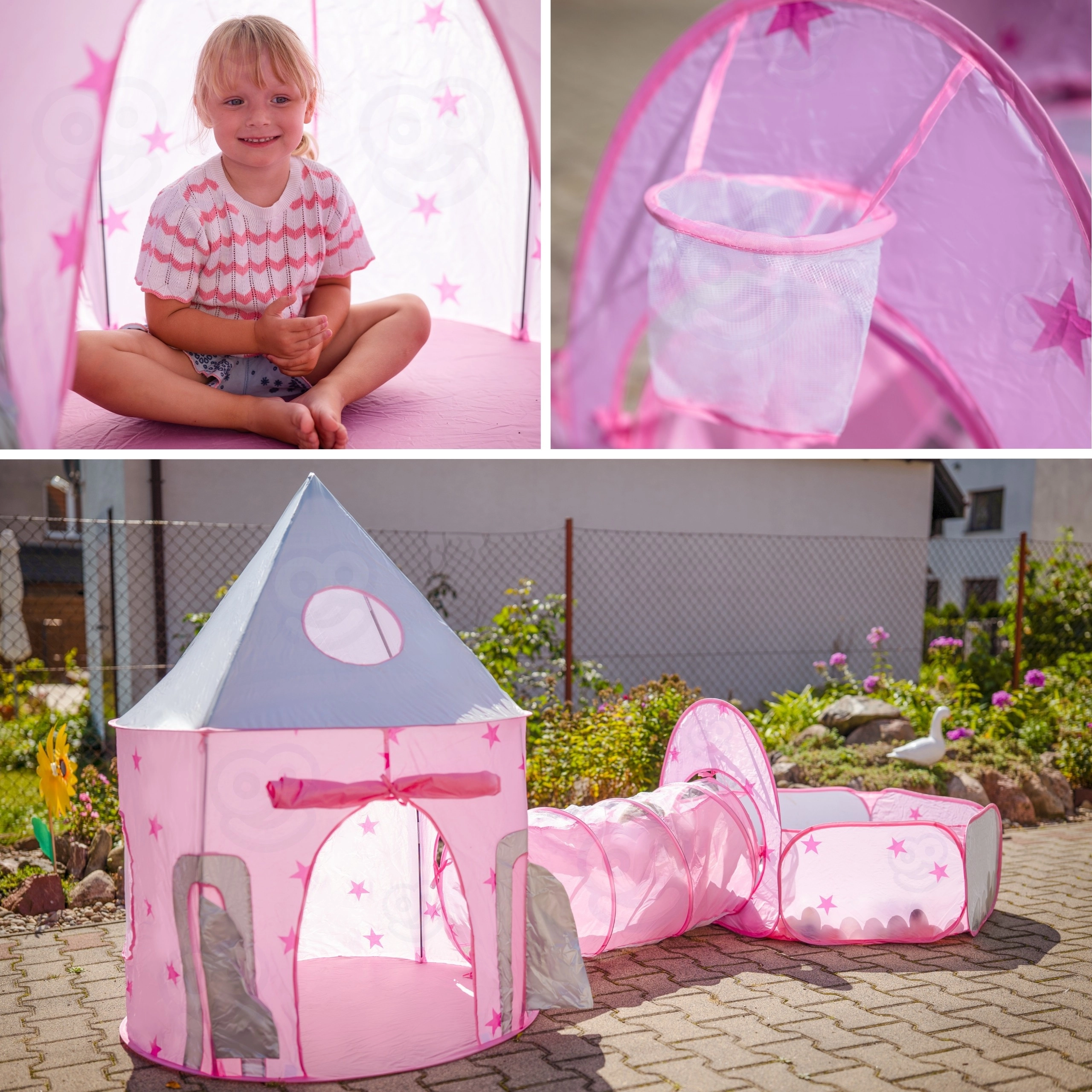 El set de juego rosa 3 en 1 de la marca Woopie transforma cualquier habitación o jardín en un reino de cuento. Incluye una tienda con forma de castillo, un túnel de conexión y una amplia piscina de bolas seca. Gracias a su estructura pop-up se monta y pliega fácilmente, ideal para juego activo, desarrollo de la imaginación y diversión compartida. Ligero, plegable, ventilado con malla y perfecto para uso interior y exterior.