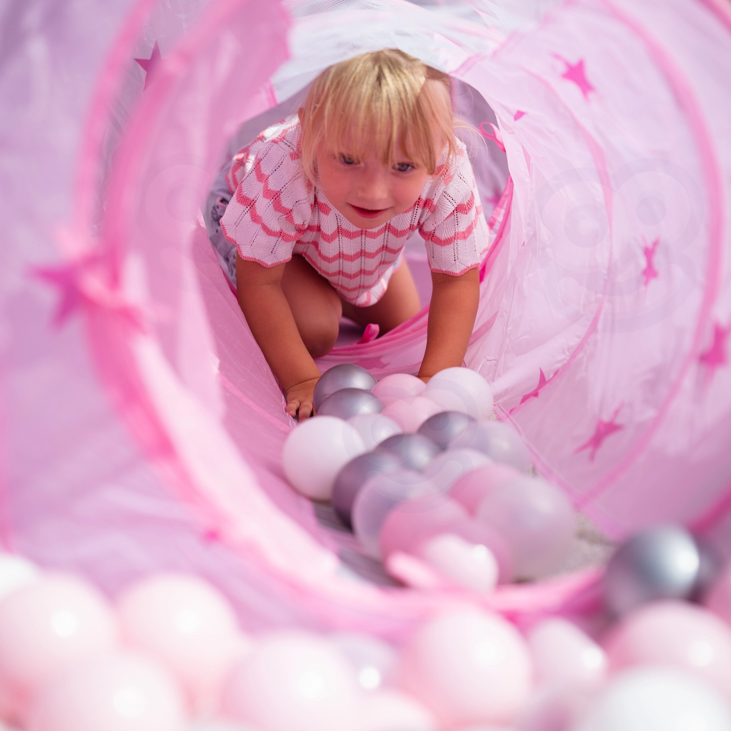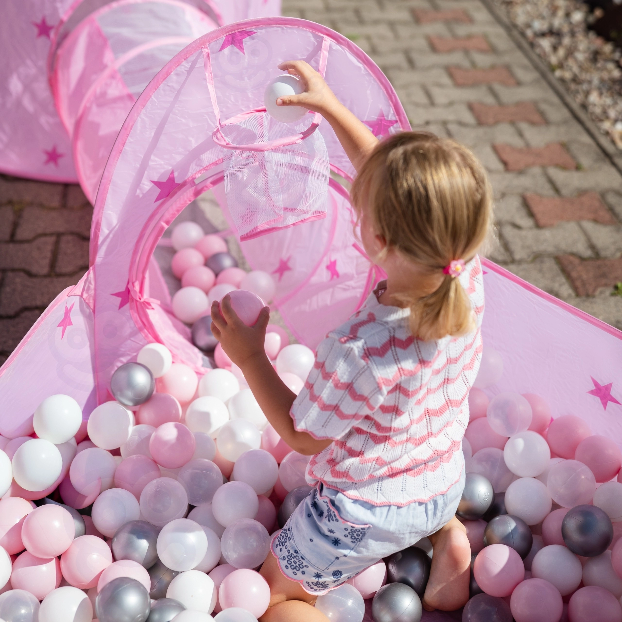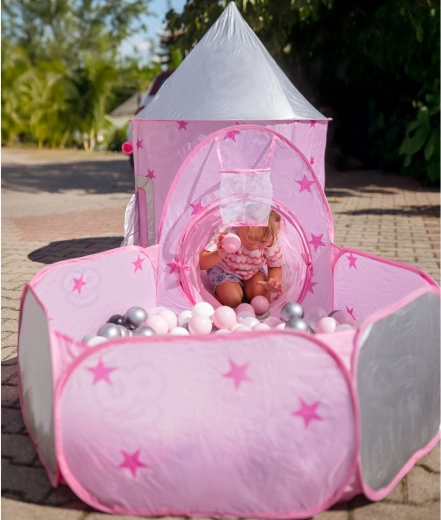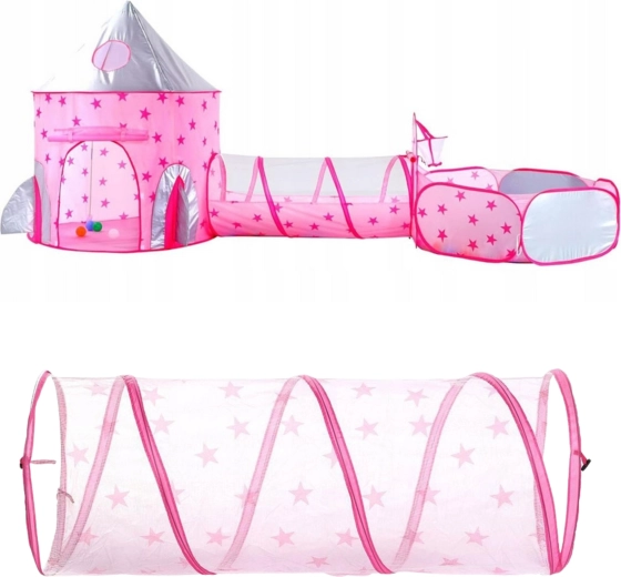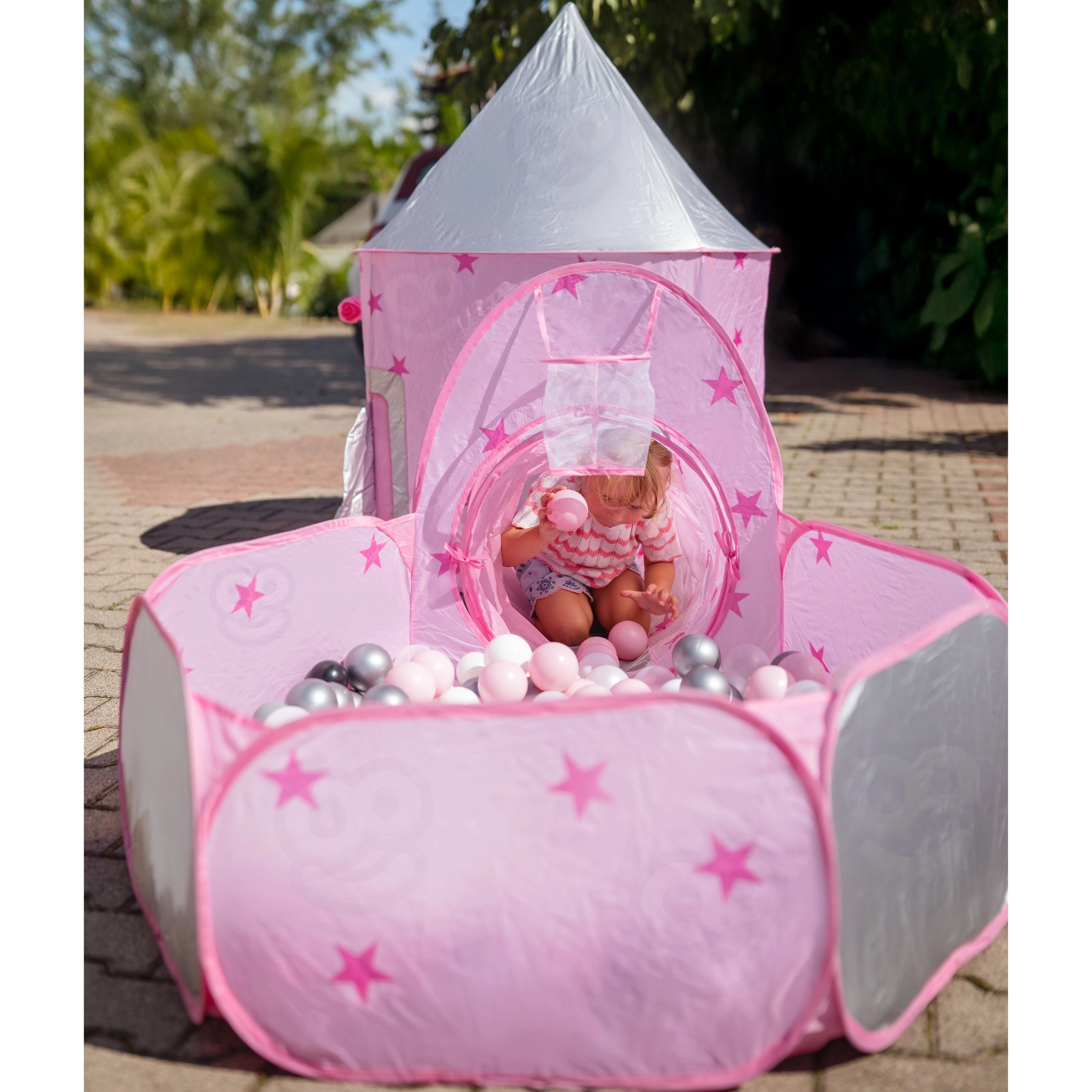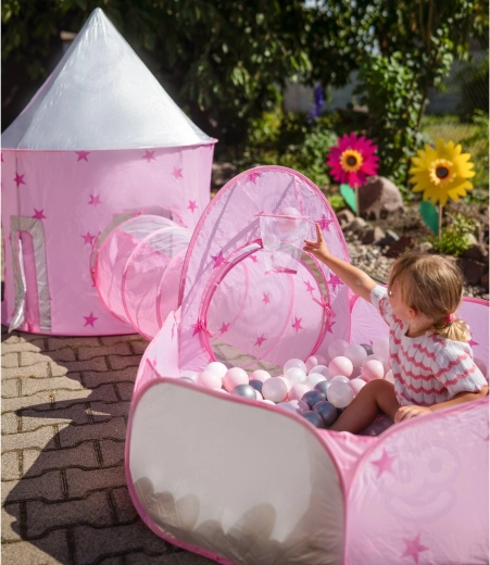 El set de juego rosa 3 en 1 de la marca Woopie transforma cualquier habitación o jardín en un reino de cuento. Incluye una tienda con forma de castillo, un túnel de conexión y una amplia piscina de bolas seca. Gracias a su estructura pop-up se monta y pliega fácilmente, ideal para juego activo, desarrollo de la imaginación y diversión compartida. Ligero, plegable, ventilado con malla y perfecto para uso interior y exterior.
