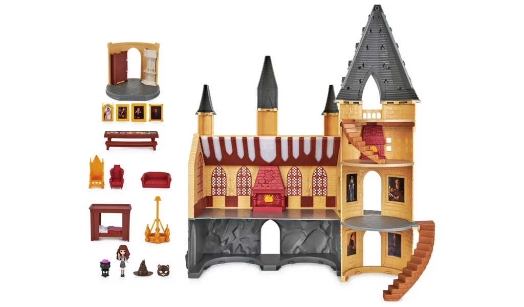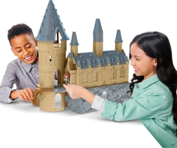 El castillo cuenta con elementos arquitectónicos detallados y colores vibrantes que realzan la magia del mundo de Harry Potter.