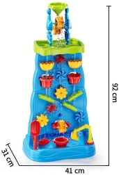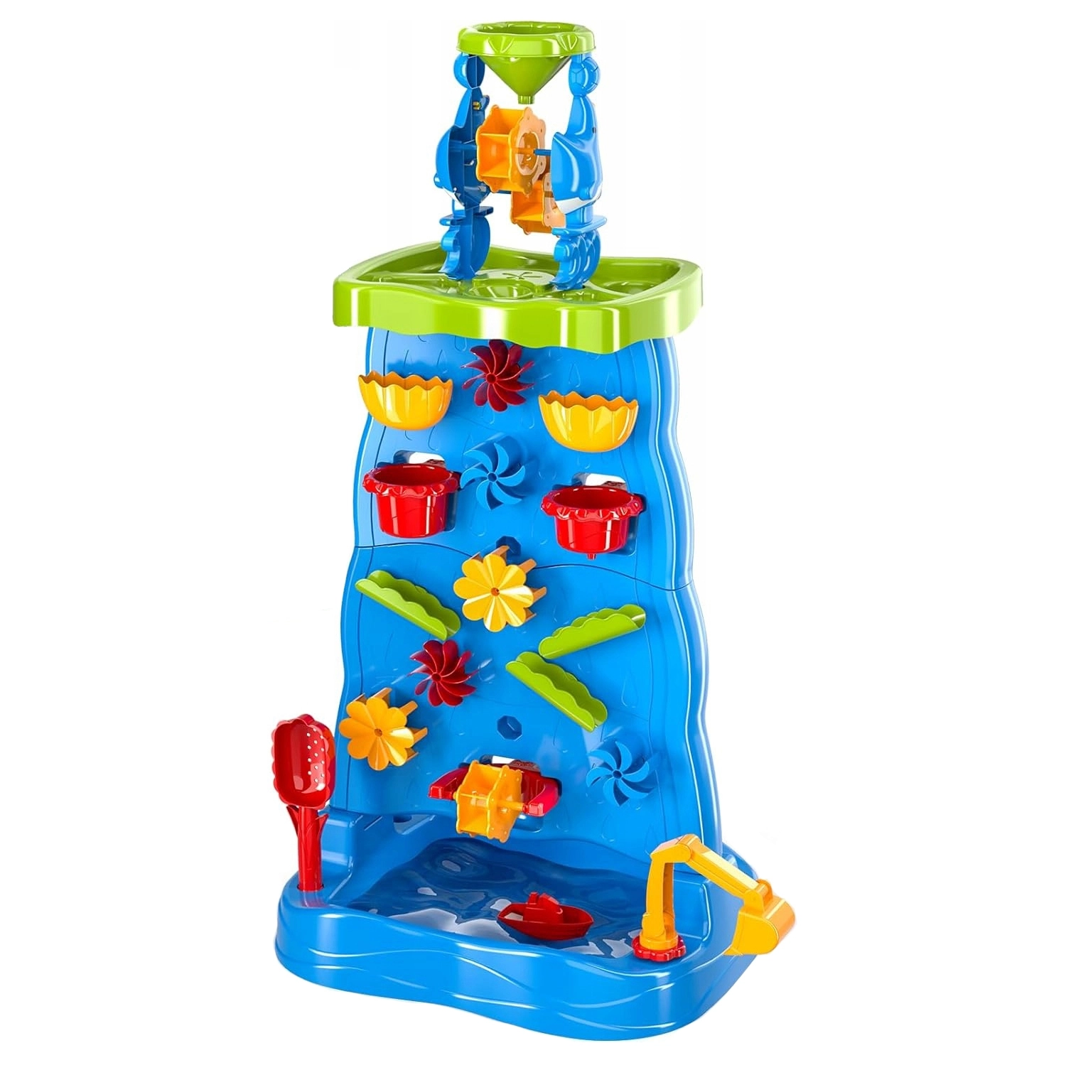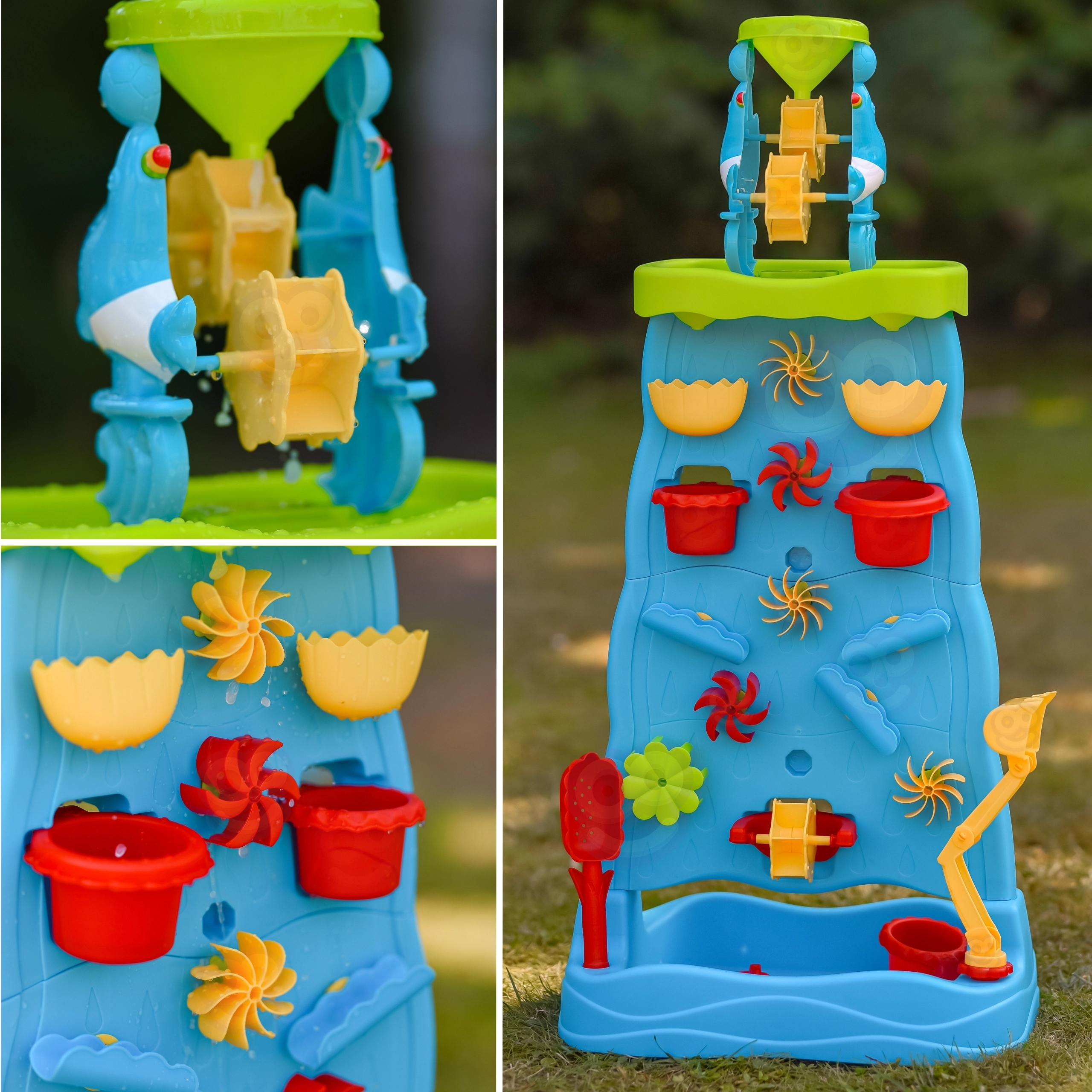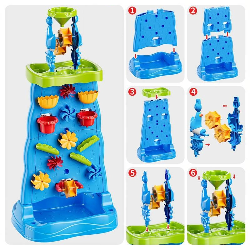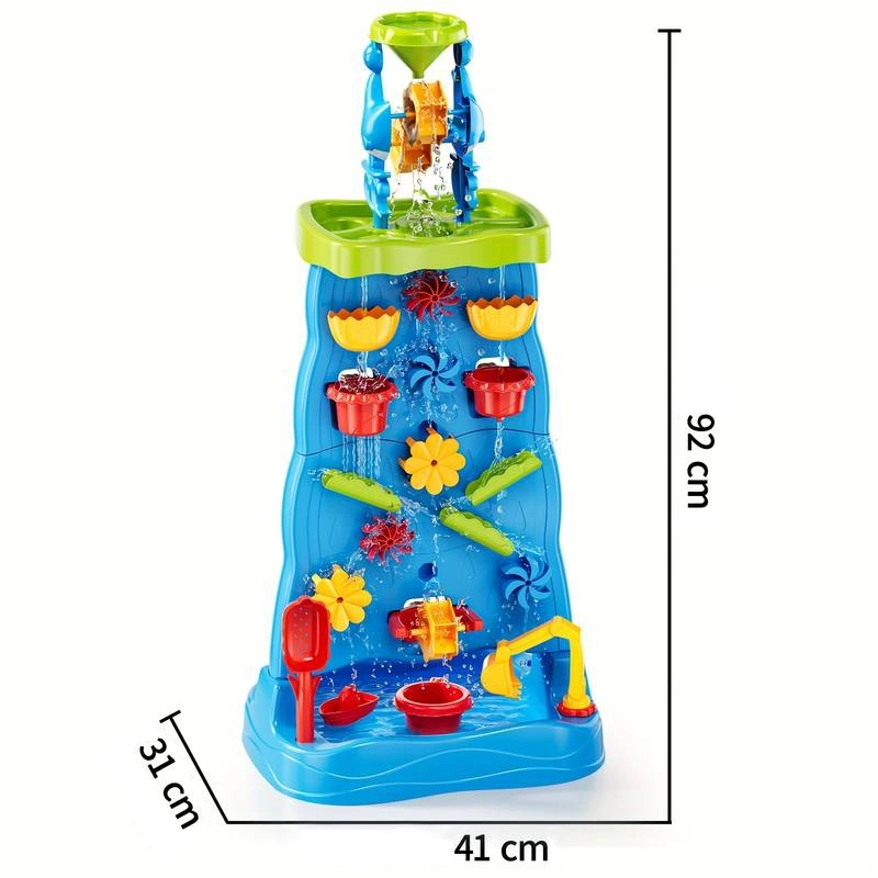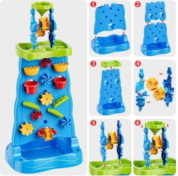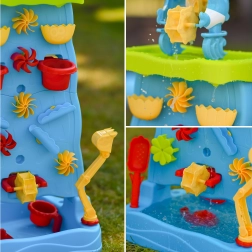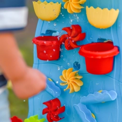 La base ancha y la pared accesible desde ambos lados permiten el juego compartido. Los niños pueden verter agua simultáneamente, observar las cascadas y las ruedas giratorias: ideal para compartir y colaborar.