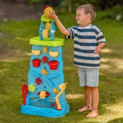 El montaje es rápido y sin herramientas. Incluye abundantes accesorios: palas, rastrillo, tamices, regadera, cubo, moldes y vasitos para agua. El juguete fomenta la percepción sensorial, el pensamiento lógico y la resolución de problemas, todo mediante divertidos experimentos.