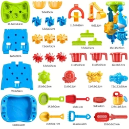 - 2× pala, rastrillo, 2× tamiz, regadera, cubo, 4× molde, 5× vasito para agua, 10× rueda de agua, rueda de agua doble con embudo, 3× canal