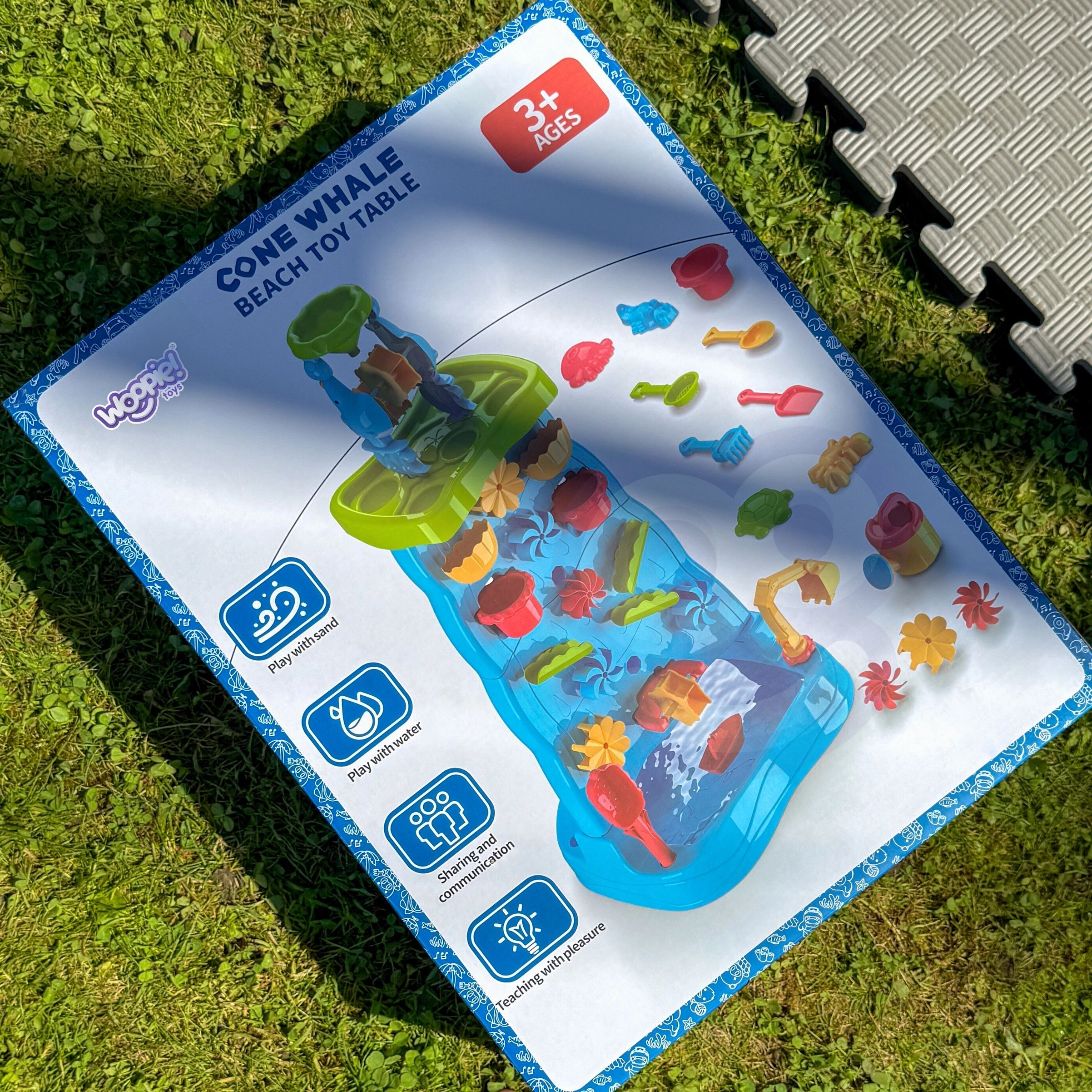Convierte el jardín o la playa en una zona llena de risas y descubrimientos con la mesa de agua y pared de agua de doble cara XXL WOOPIE 2 en 1. Los niños pueden verter, trasvasar y observar cómo el agua pone en marcha molinos, ruedas y vasitos. Gracias al rico set de accesorios, crearán su propio mini circuito de agua y disfrutarán del juego conjunto desde ambos lados. El juguete es estable, espacioso y adecuado incluso para varios niños a la vez, desarrollando la motricidad fina, la coordinación mano-ojo y la creatividad.