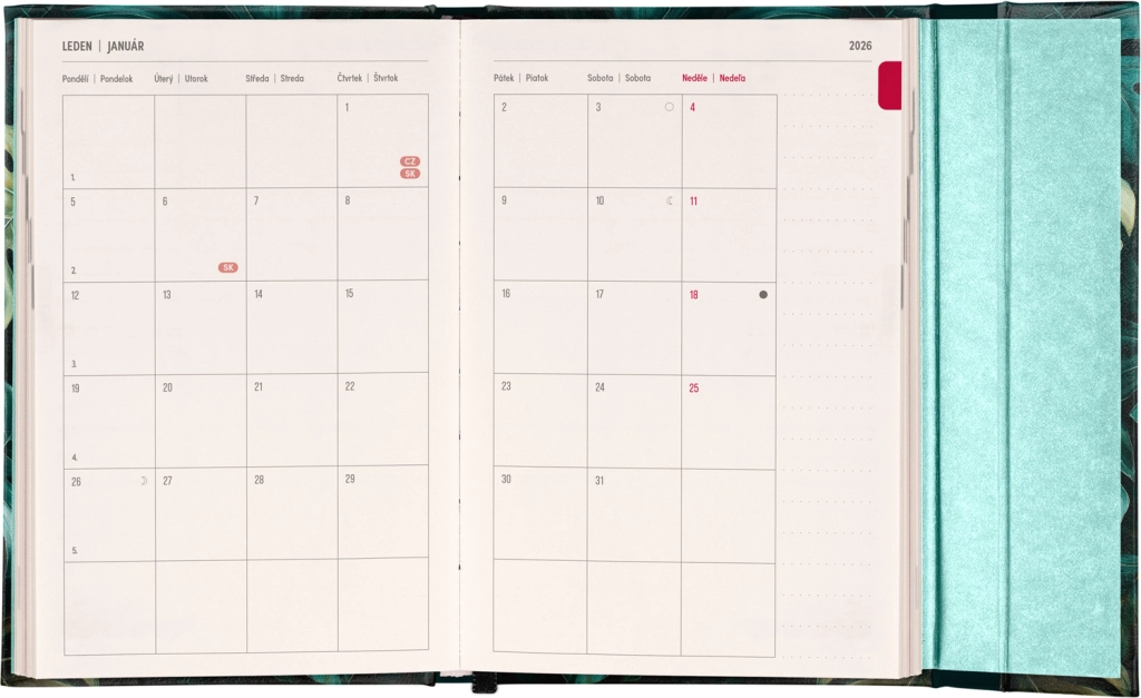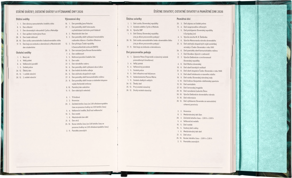 Si buscas una forma eficaz de mantener tus planes bajo control, la agenda semanal Monstera 2026 es la elección ideal. Gracias al diseño horizontal y a la integración del calendario checo y eslovaco, la agenda ofrece espacio para tus tareas personales y laborales. Disfruta de prácticos resúmenes mensuales, ideales para planificar vacaciones o escapadas más largas. La agenda también incluye una lista de festivos y onomásticos checos y eslovacos.