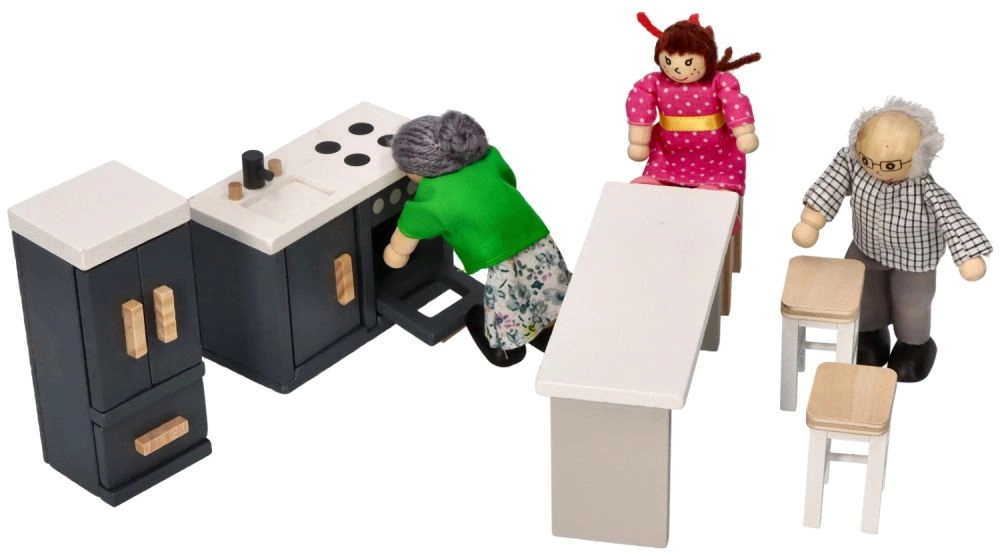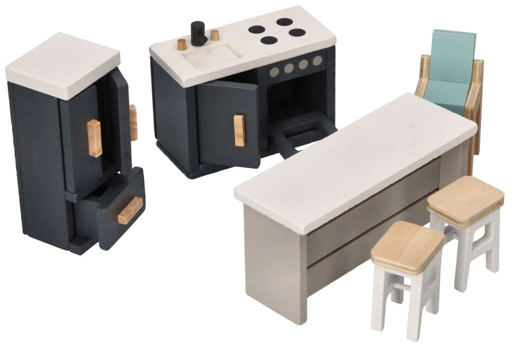 Adéntrate en un mundo de fantasía con nuestro mobiliario de cocina para casa de muñecas. Este adorable set incluye: