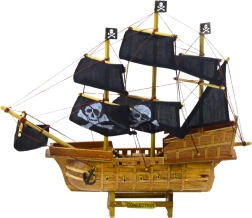 El modelo de un velero de tres mástiles en estilo pirata cautivará a cualquier amante de las aventuras marinas. Diseñado según legendarios barcos corsarios de los siglos XVII y XVIII, este modelo ofrece un casco de madera natural con imitaciones laterales de cañones y una marcada línea de popa y proa. Las velas negras de lona con estampados de calavera y huesos cruzados, así como las banderas piratas, otorgan al barco un aspecto irresistible y característico que recuerda a los bandidos del mar y a la legendaria libertad en alta mar.