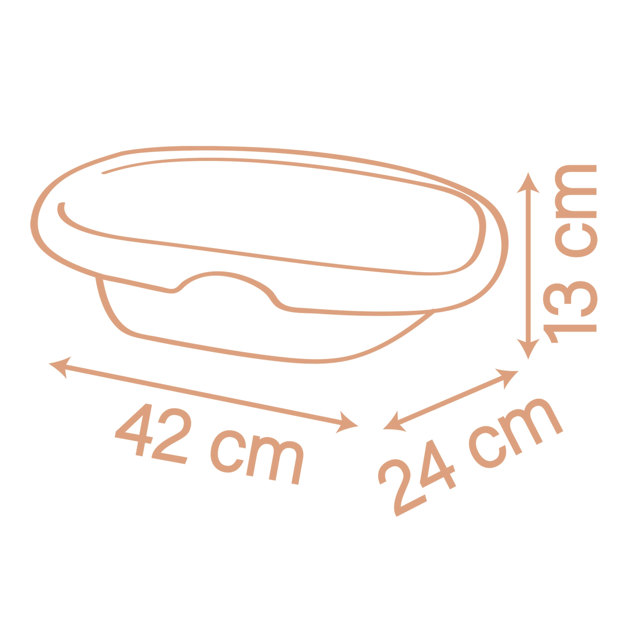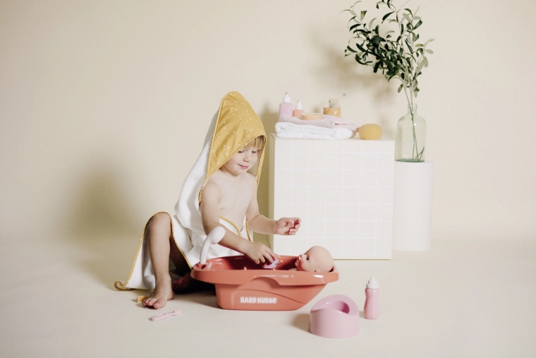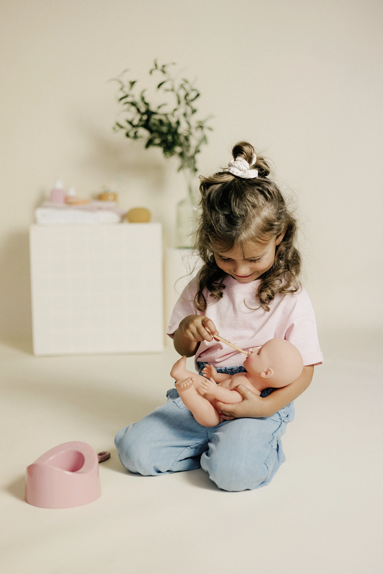 Incluye una amplia variedad de accesorios: orinal, termómetro, cepillo de dientes, botes y otros complementos fáciles de agarrar para los niños. El set está fabricado en Francia y utiliza materiales reciclados (76 %), lo que lo convierte en una opción ecológica. Apto para muñecas de hasta 42 cm.