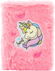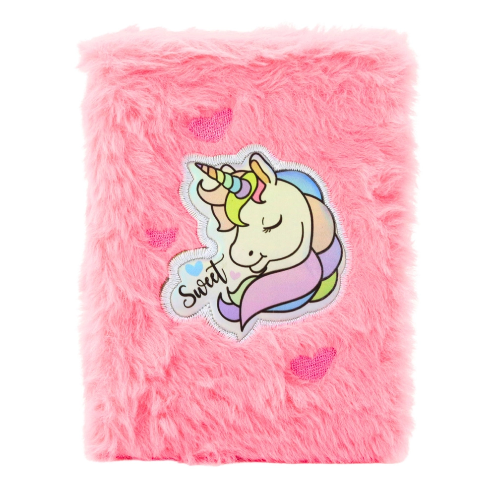 Bloc de notas de peluche con un adorable unicornio sobre un fondo holográfico, un producto excepcional que encanta por su apariencia y practicidad. La cubierta rosa combina un material suave con un efecto holográfico brillante, creando una impresión de cuento de hadas.