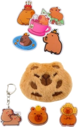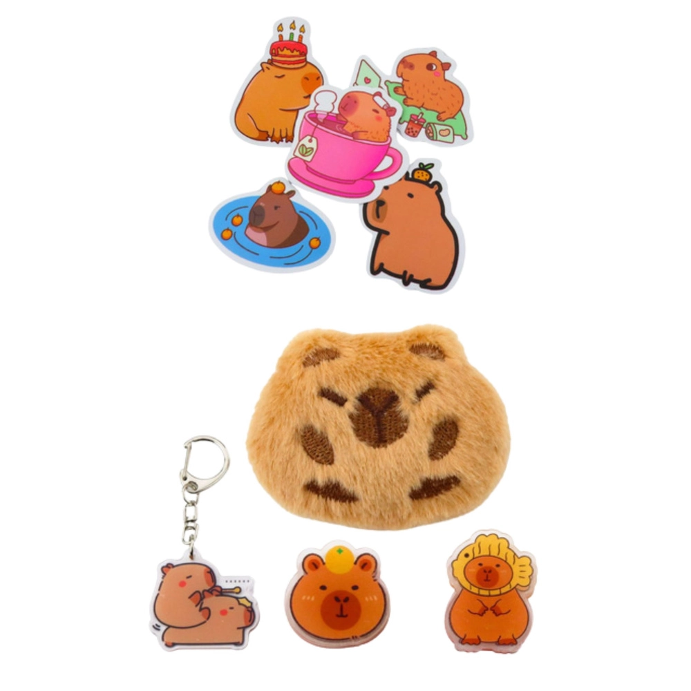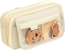 El estuche está fabricado con material resistente que asegura una larga vida útil. Su elegante color beige se adapta a diferentes estilos. Además, incluye una capibara de peluche que puedes sujetar al estuche, a la mochila o a la ropa. El set de accesorios también incluye un llavero con motivo de capibara, dos clips y cinco pegatinas de capibara.