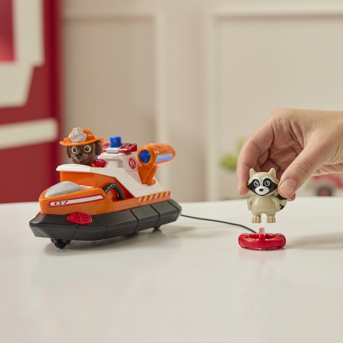 Zuma, de más de 5 cm de altura con su traje de bombero, está preparado para salvar el día. La lancha de bomberos está equipada con un aro salvavidas sujeto a una cuerda, lo que garantiza montones de aventuras llenas de acción. Zuma cuenta además con un pequeño mapache que se puede rescatar. Los niños pueden pulsar el botón para lanzar el aro salvavidas, en el que el mapache encaja a la perfección. Con el estilo auténtico de la Patrulla Canina, este juguete luce exactamente como en la serie, inspirando a los niños a vivir grandes aventuras.