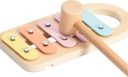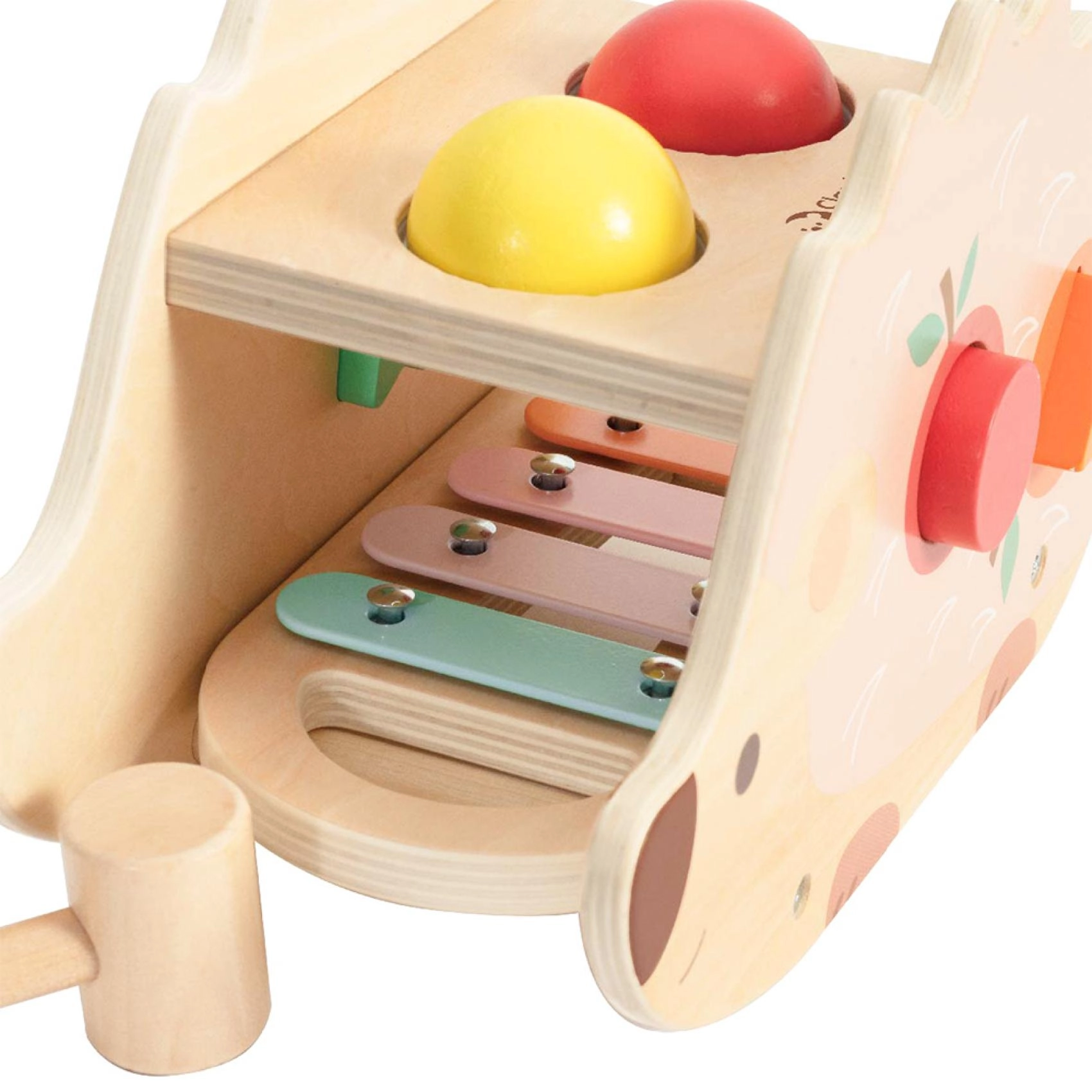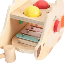 Este juguete multifuncional de madera ofrece dos actividades favoritas en una: golpear formas de colores y tocar el xilófono. Perfecto para desarrollar la motricidad y el sentido musical de los niños.