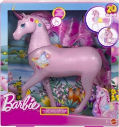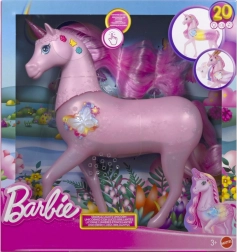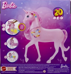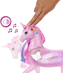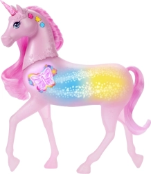 El unicornio mágico Barbie convierte cada juego en un espectáculo colorido lleno de luces, sonidos y música. Con una simple caricia en la cabeza iniciarás el show y, con los tres botones de colores, crearás hasta 20 combinaciones únicas, desde destellos suaves hasta coreografías de luces espectaculares.