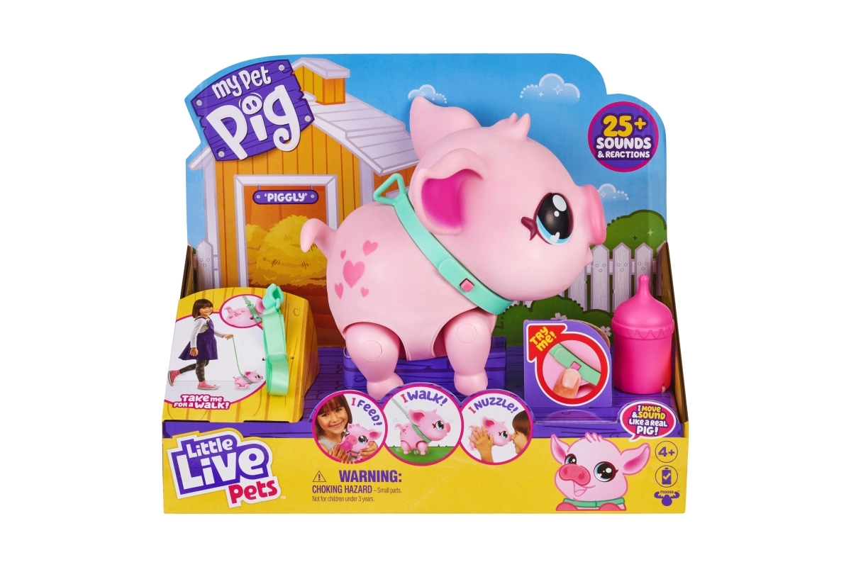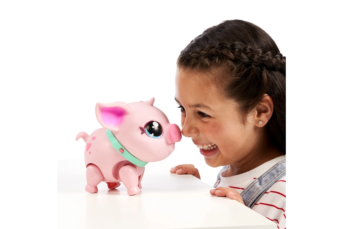 Descubre una mascota mágica que cobra vida en las manos de los niños. Piggly es un suave cerdito rosa con ojitos tiernos y un collar, que responde al tacto, al movimiento y a los cuidados. Con la correa podrás llevarlo fácilmente de paseo, y cuando tenga hambre, lo alimentarás con el biberón.