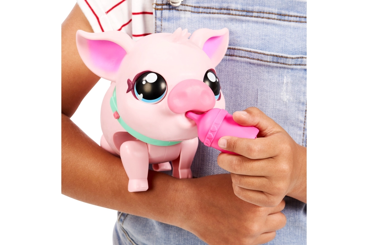 Incluye un biberón rosa. Alimenta a tu cerdito, acarícialo y observa sus reacciones: cuidar de tu mascota como si fuera de verdad.