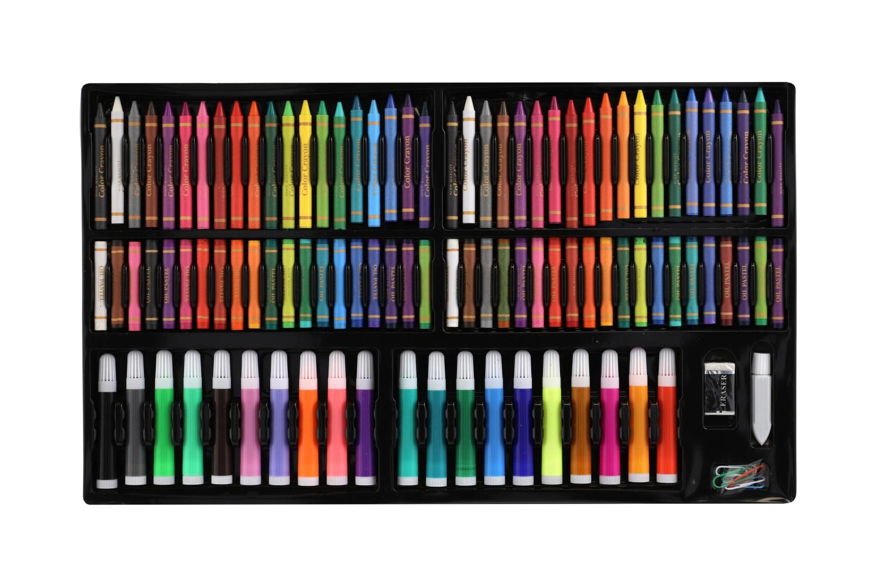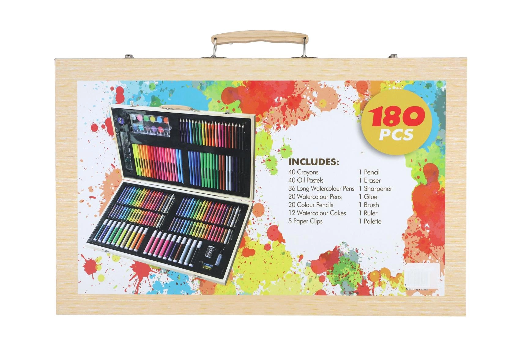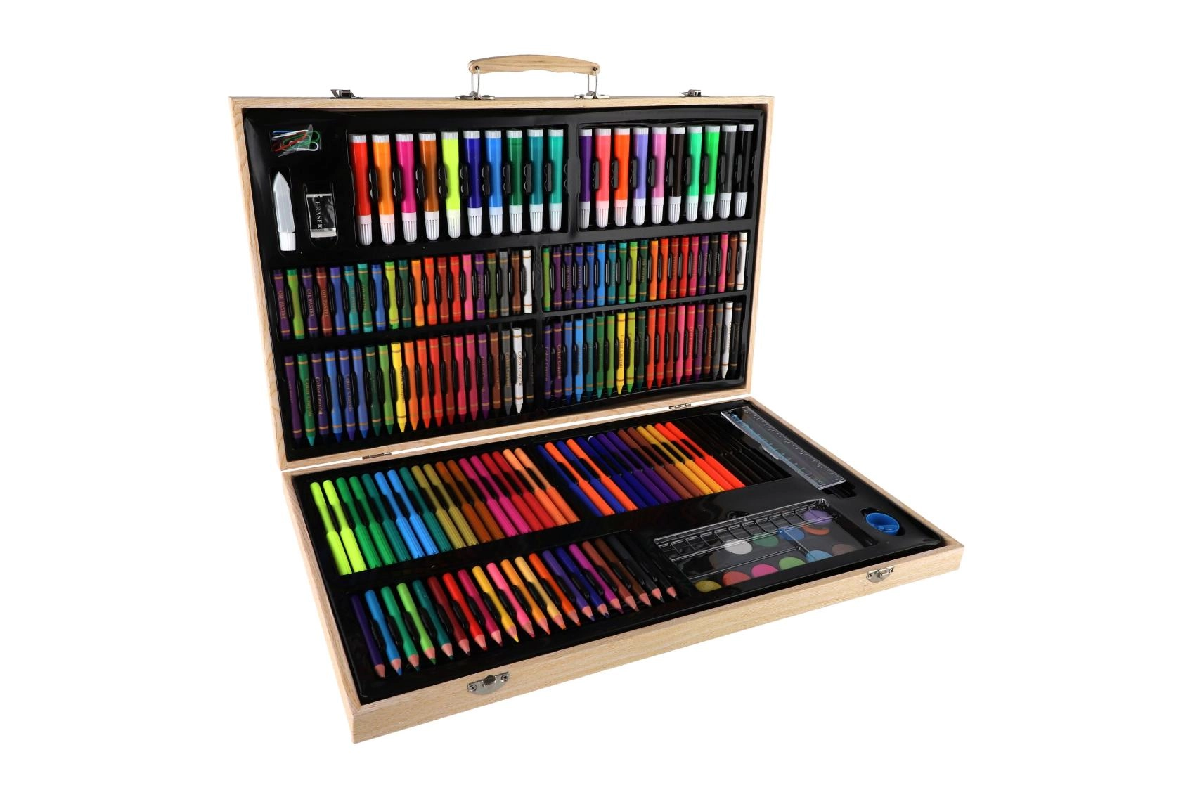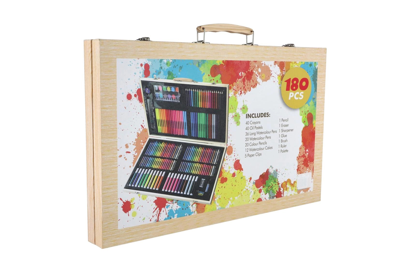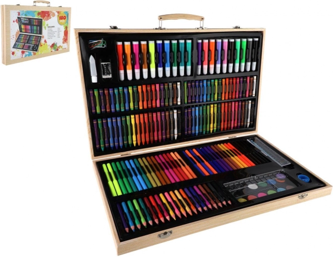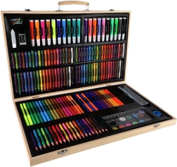Descubre un versátil set creativo para pintar y dibujar que incluye 180 piezas organizadas en un elegante maletín de madera con cierre. Perfecto para manualidades en casa, proyectos escolares y como set artístico portátil para viajes.