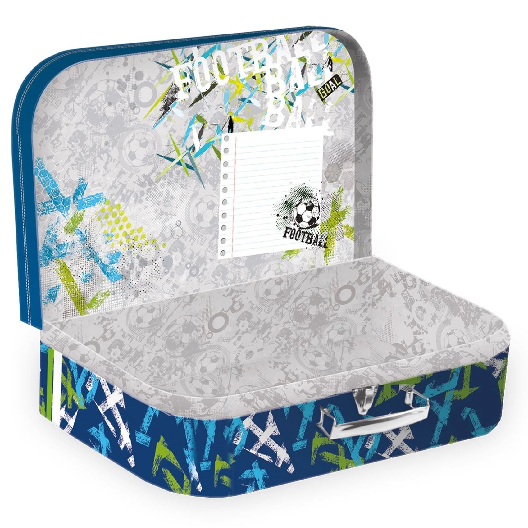 El maletín escolar de cartón con el motivo Goal Time es una elección perfecta para organizar y guardar tu material escolar. Está diseñado para ser resistente y sus dimensiones de 35x23x10 cm garantizan un espacio de almacenamiento suficiente.